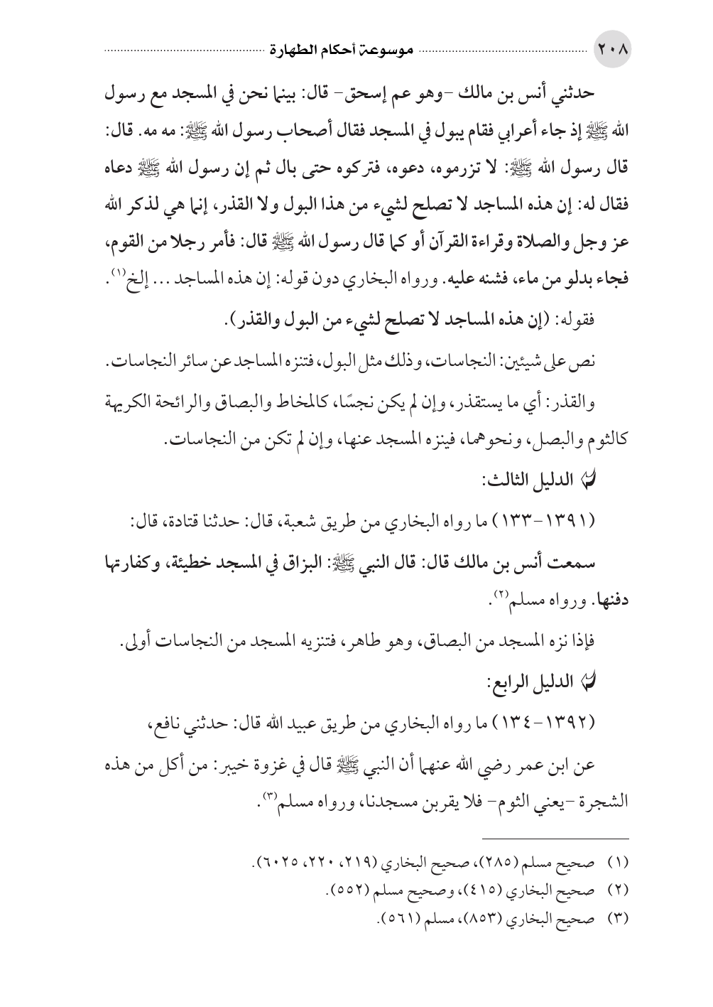 حدثني أنس بن مالك -وهو عم إسحق- قال: بينما نحن في المسجد مع رسول الله صلى الله عليه وسلم إذ جاء أعرابي فقام يبول في المسجد فقال أصحاب رسول الله صلى الله عليه وسلم: مه مه. قال: قال رسول الله صلى الله عليه وسلم: لا تزرموه، دعوه، فتركوه حتى بال ثم إن رسول الله صلى الله عليه وسلم دعاه فقال له: إن هذه المساجد لا تصلح لشيء من هذا البول ولا القذر، إنما هي لذكر الله عز وجل والصلاة وقراءة القرآن أو كما قال رسول الله صلى الله عليه وسلم قال: فأمر رجلا من القوم، فجاء بدلو من ماء، فشنه عليه. ورواه البخاري دون قوله: إن هذه المساجد ... إلخ (¬١).
