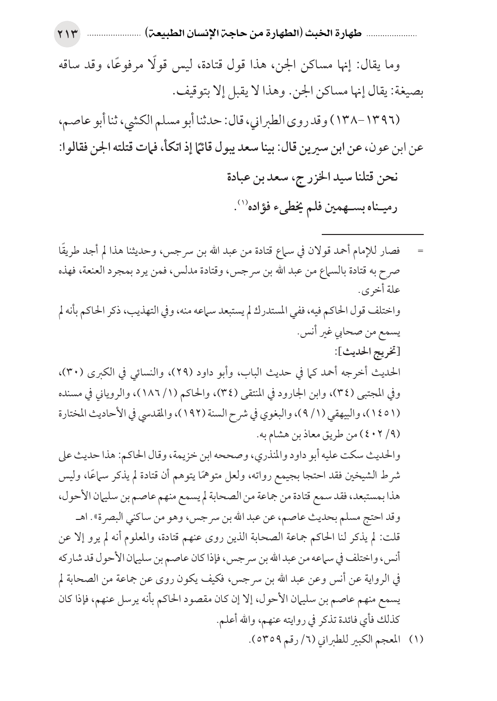 (١٣٩٦ - ١٣٨) وقد روى الطبراني، قال: حدثنا أبو مسلم الكشي، ثنا أبو عاصم، عن ابن عون، عن ابن سيرين قال: بينا سعد يبول قائمًا إذ اتكأ، فمات قتلته الجن فقالوا: