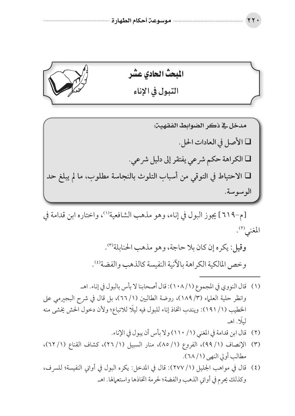 (¬٤) قال في مواهب الجليل (١/ ٢٧٧): قال في المدخل: يكره البول في أواني النفيسة؛ للسرف، وكذلك يحرم في أواني الذهب والفضة؛ لحرمة اتخاذها واستعمالها. اهـ