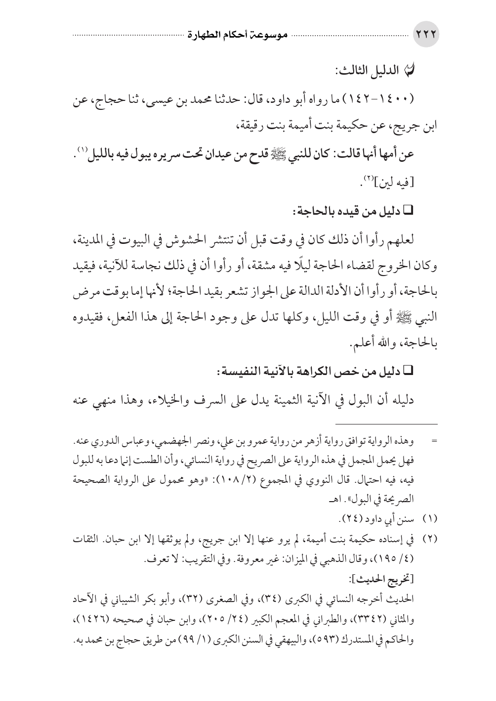 (١٤٠٠ - ١٤٢) ما رواه أبو داود، قال: حدثنا محمد بن عيسى، ثنا حجاج، عن ابن جريج، عن حكيمة بنت أميمة بنت رقيقة،