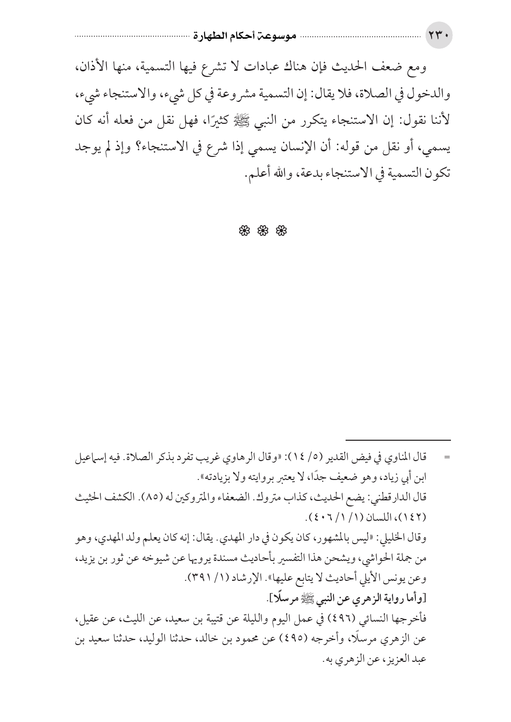 ومع ضعف الحديث فإن هناك عبادات لا تشرع فيها التسمية، منها الأذان، والدخول في الصلاة، فلا يقال: إن التسمية مشروعة في كل شيء، والاستنجاء شيء، لأننا نقول: إن الاستنجاء يتكرر من النبي صلى الله عليه وسلم كثيرًا، فهل نقل من فعله أنه كان يسمي، أو نقل من قوله: أن الإنسان يسمي إذا شرع في الاستنجاء؟ وإذ لم يوجد تكون التسمية في الاستنجاء بدعة، والله أعلم.