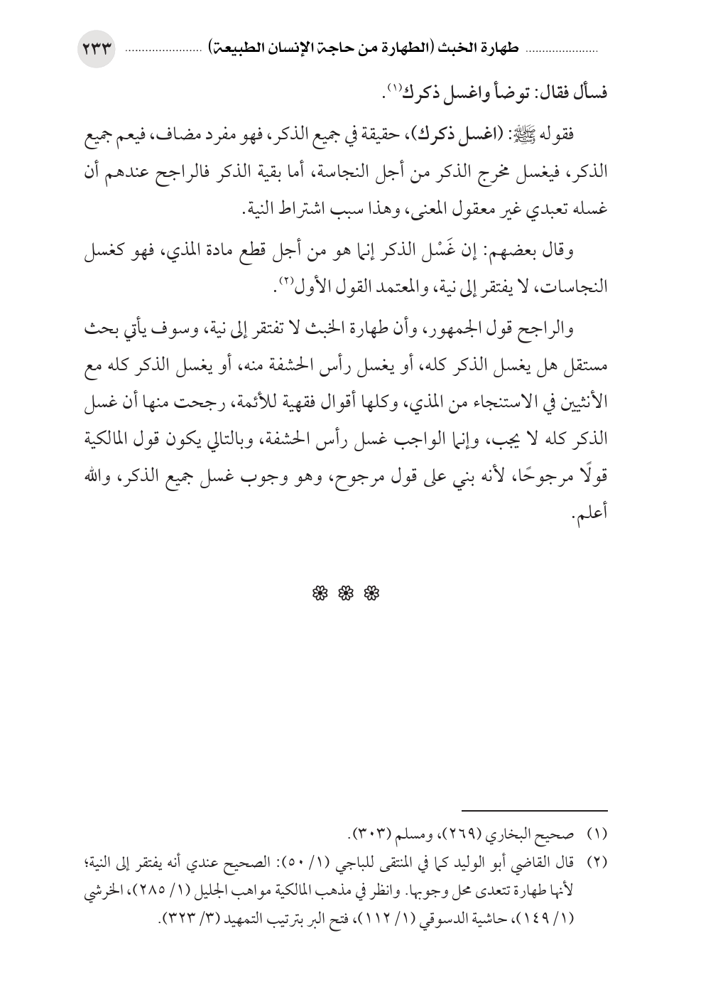 والراجح قول الجمهور، وأن طهارة الخبث لا تفتقر إلى نية، وسوف يأتي بحث مستقل هل يغسل الذكر كله، أو يغسل رأس الحشفة منه، أو يغسل الذكر كله مع الأنثيين في الاستنجاء من المذي، وكلها أقوال فقهية للأئمة، رجحت منها أن غسل الذكر كله لا يجب، وإنما الواجب غسل رأس الحشفة، وبالتالي يكون قول المالكية قولًا مرجوحًا، لأنه بني على قول مرجوح، وهو وجوب غسل جميع الذكر، والله أعلم.