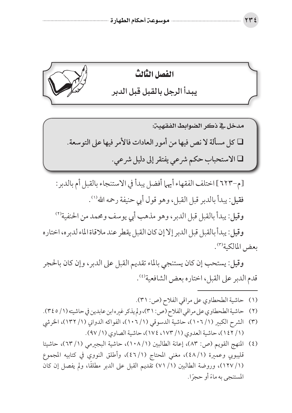 (¬٤) المنهج القويم (ص: ٨٣)، إعانة الطالبين (١/ ١٠٨)، حاشية البجيرمي (١/ ٦٣)، حاشيتا قليبوبي وعميرة (١/ ٤٨)، مغني المحتاج (١/ ٤٦)، وأطلق النووي في كتابيه المجموع (١/ ١٢٧)، وروضة الطالبين (١/ ٧١) تقديم القبل على الدبر مطلقًا، ولم يفصل إن كان المستنجى به ماءً أو حجرًا.