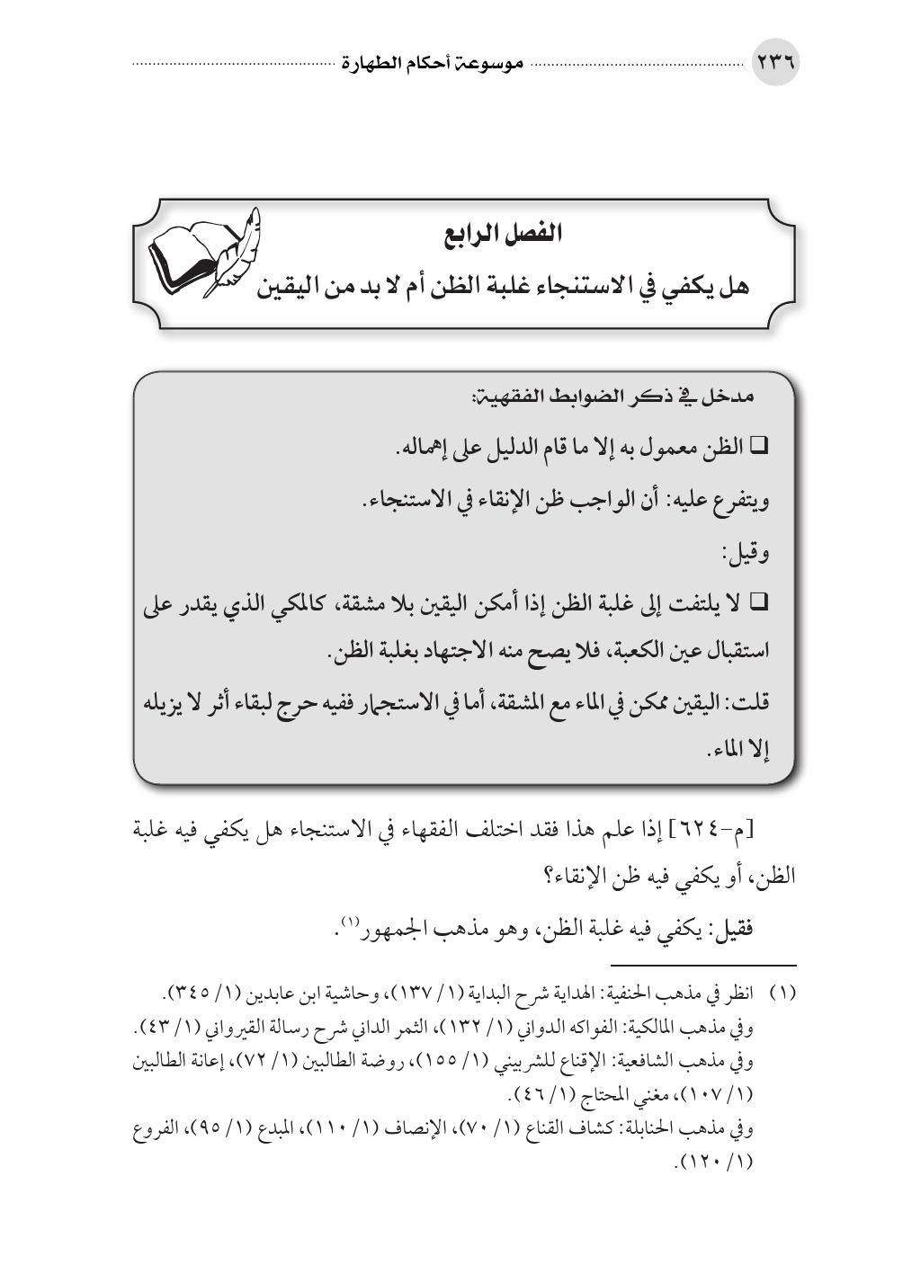 [م-٦٢٤] إذا علم هذا فقد اختلف الفقهاء في الاستنجاء هل يكفي فيه غلبة الظن، أو يكفي فيه ظن الإنقاء؟