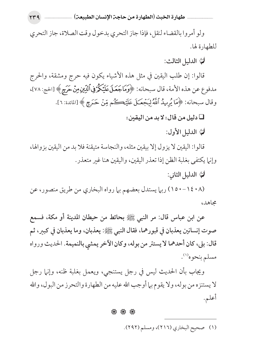 قالوا: إن طلب اليقين في مثل هذه الأشياء يكون فيه حرج ومشقة، والحرج مدفوع عن هذه الأمة، قال سبحانه: (وَمَا جَعَلَ عَلَيْكُمْ فِي الدِّينِ مِنْ حَرَجٍ) [الحج: ٧٨]، وقال سبحانه: (مَا يُرِيدُ اللَّهُ لِيَجْعَلَ عَلَيْكُم مِّنْ حَرَجٍ) [المائدة: ٦].