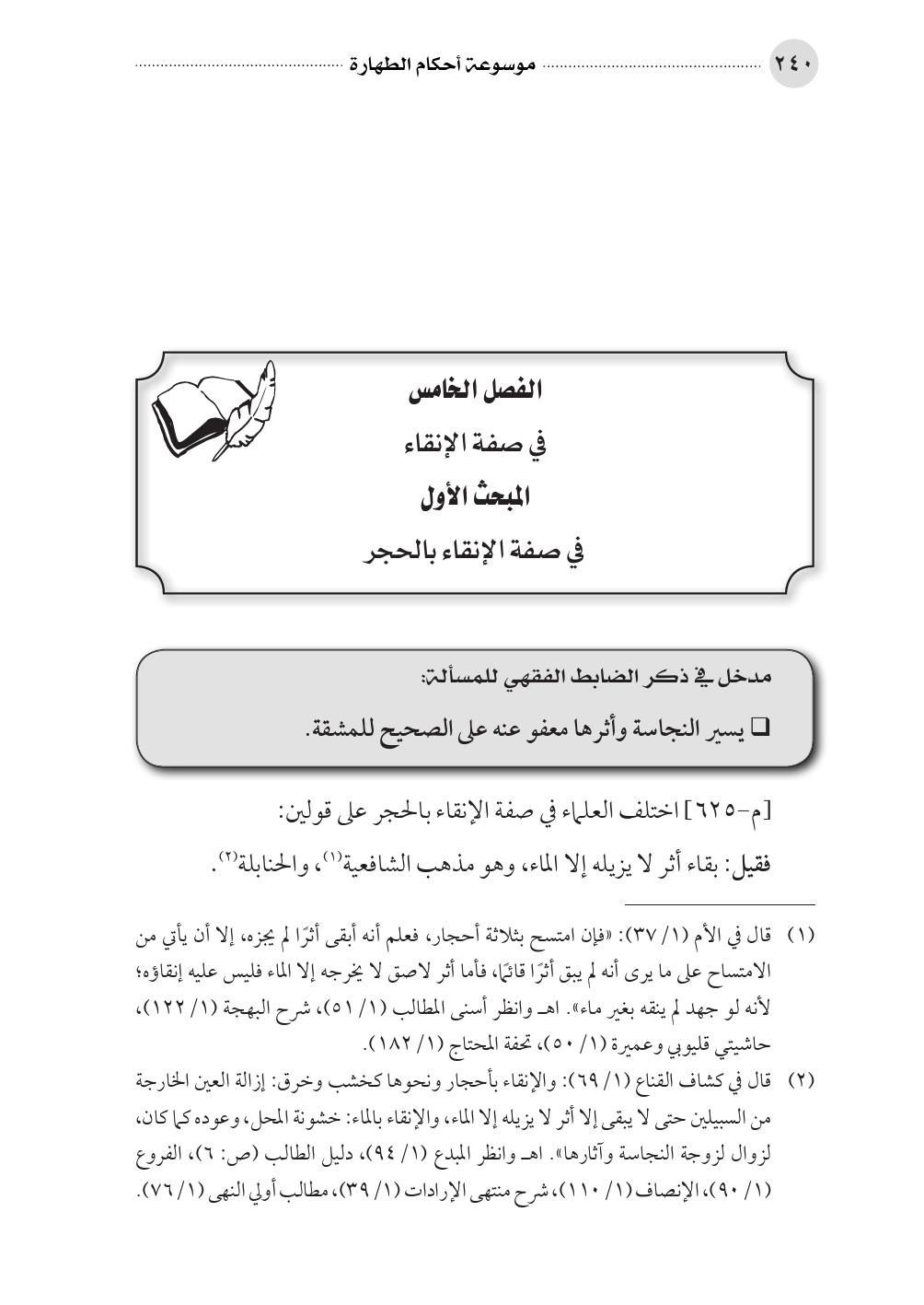 (¬١) قال في الأم (١/ ٣٧): «فإن امتسح بثلاثة أحجار، فعلم أنه أبقى أثرًا لم يجزه، إلا أن يأتي من الامتساح على ما يرى أنه لم يبق أثرًا قائمًا، فأما أثر لاصق لا يخرجه إلا الماء فليس عليه إنقاؤه؛ لأنه لو جهد لم ينقه بغير ماء». اهـ وانظر أسنى المطالب (١/ ٥١)، شرح البهجة (١/ ١٢٢)، حاشيتي قليوبي وعميرة (١/ ٥٠)، تحفة المحتاج (١/ ١٨٢).