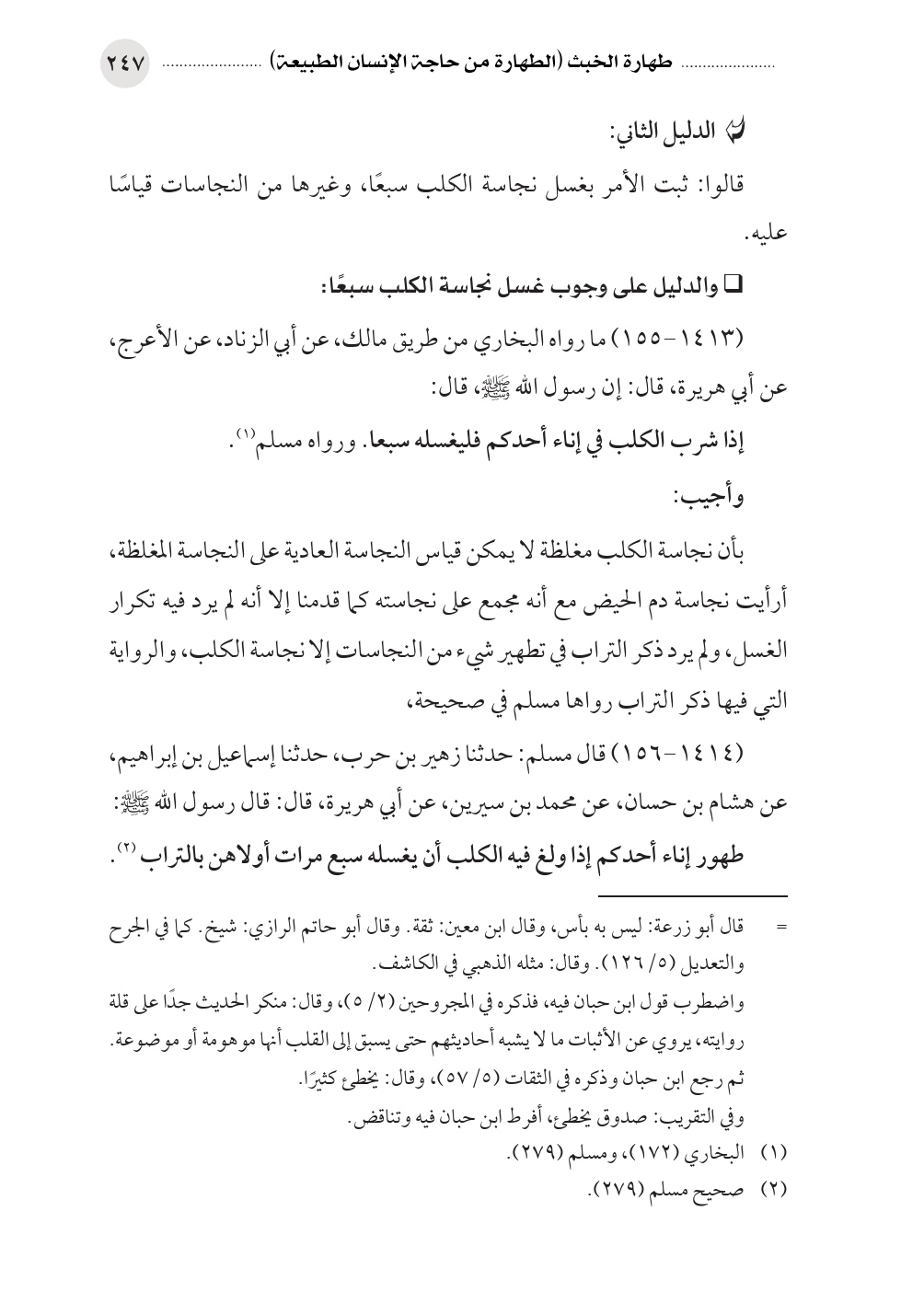 بأن نجاسة الكلب مغلظة لا يمكن قياس النجاسة العادية على النجاسة المغلظة، أرأيت نجاسة دم الحيض مع أنه مجمع على نجاسته كما قدمنا إلا أنه لم يرد فيه تكرار الغسل، ولم يرد ذكر التراب في تطهير شيء من النجاسات إلا نجاسة الكلب، والرواية التي فيها ذكر التراب رواها مسلم في صحيحة،