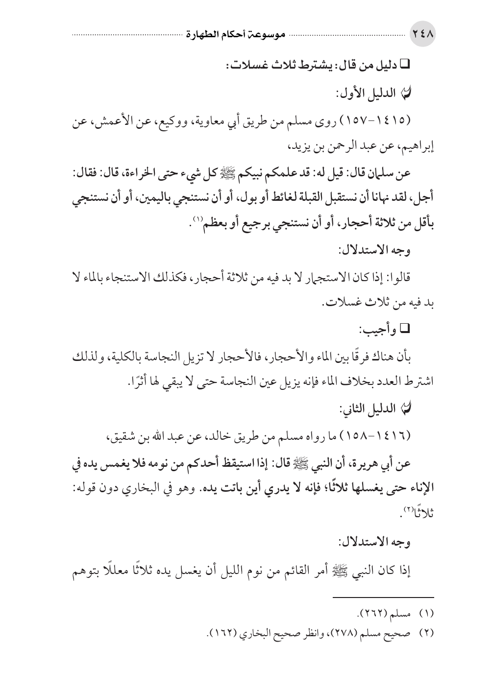 قالوا: إذا كان الاستجمار لا بد فيه من ثلاثة أحجار، فكذلك الاستنجاء بالماء لا بد فيه من ثلاث غسلات.