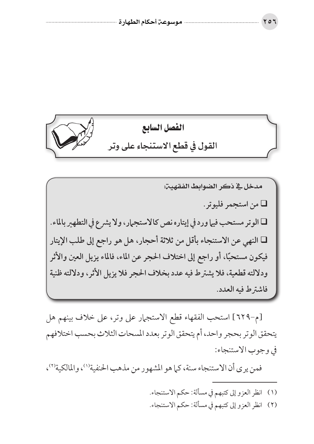 [م-٦٢٩] استحب الفقهاء قطع الاستجمار على وتر، على خلاف بينهم هل يتحقق الوتر بحجر واحد، أم يتحقق الوتر بعدد المسحات الثلاث بحسب اختلافهم في وجوب الاستنجاء: