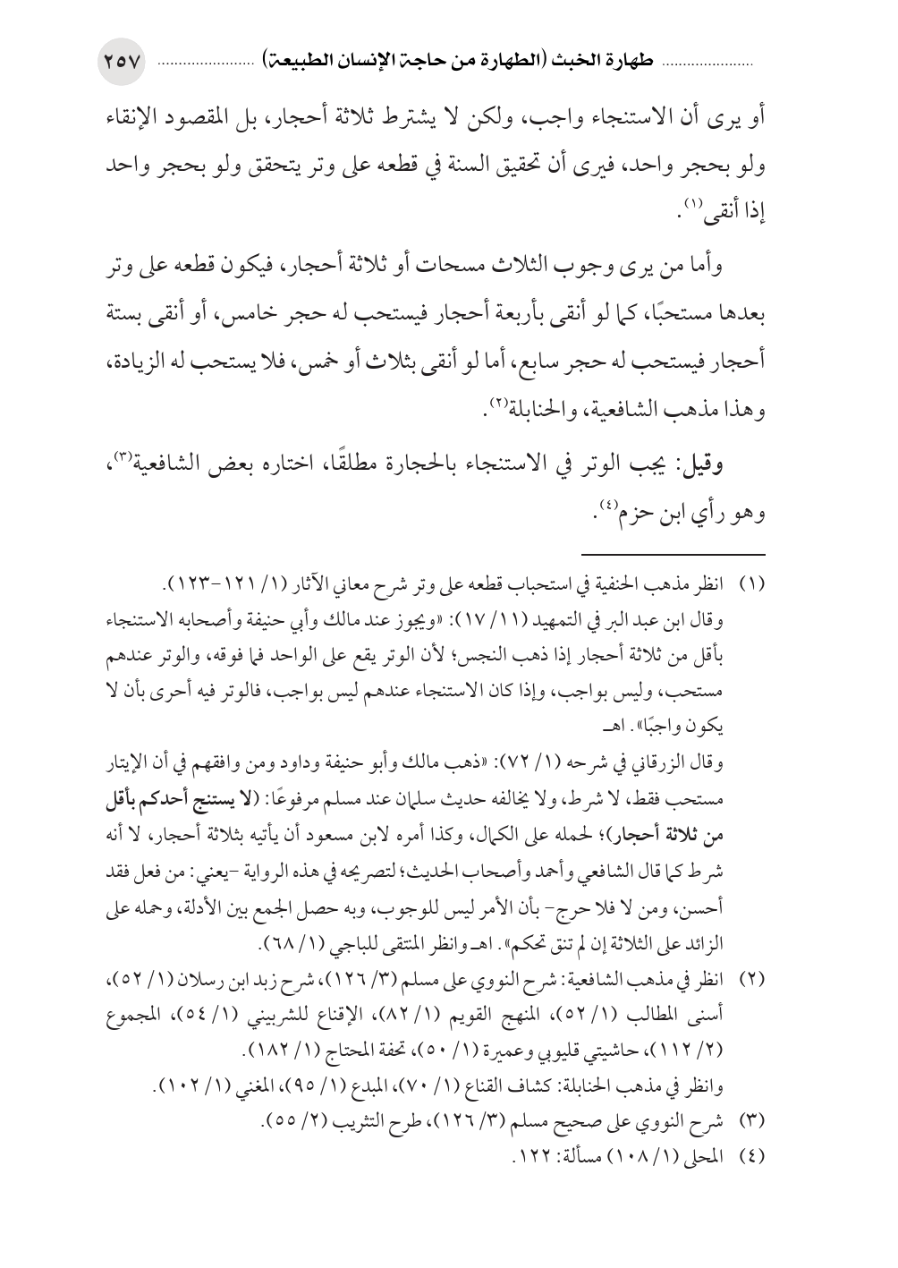 وقال الزرقاني في شرحه (١/ ٧٢): «ذهب مالك وأبو حنيفة وداود ومن وافقهم في أن الإيتار مستحب فقط، لا شرط، ولا يخالفه حديث سلمان عند مسلم مرفوعًا: (لا يستنج أحدكم بأقل من ثلاثة أحجار)؛ لحمله على الكمال، وكذا أمره لابن مسعود أن يأتيه بثلاثة أحجار، لا أنه شرط كما قال الشافعي وأحمد وأصحاب الحديث؛ لتصريحه في هذه الرواية -يعني: من فعل فقد أحسن، ومن لا فلا حرج- بأن الأمر ليس للوجوب، وبه حصل الجمع بين الأدلة، وحمله على الزائد على الثلاثة إن لم تنق تحكم». اهـ وانظر المنتقى للباجي (١/ ٦٨).
