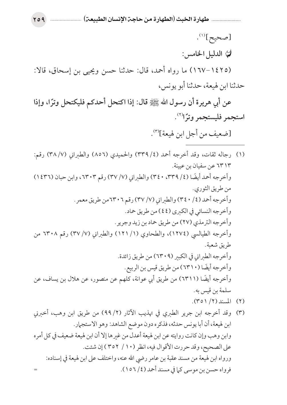 (¬٣) وقد أخرجه ابن جرير الطبري في تهذيب الآثار (٢/ ٩٩) من طريق ابن وهب، أخبرني ابن لهيعة، أن أبا يونس حدثه، فذكره دون موضع الشاهد: وهو الاستجمار.
