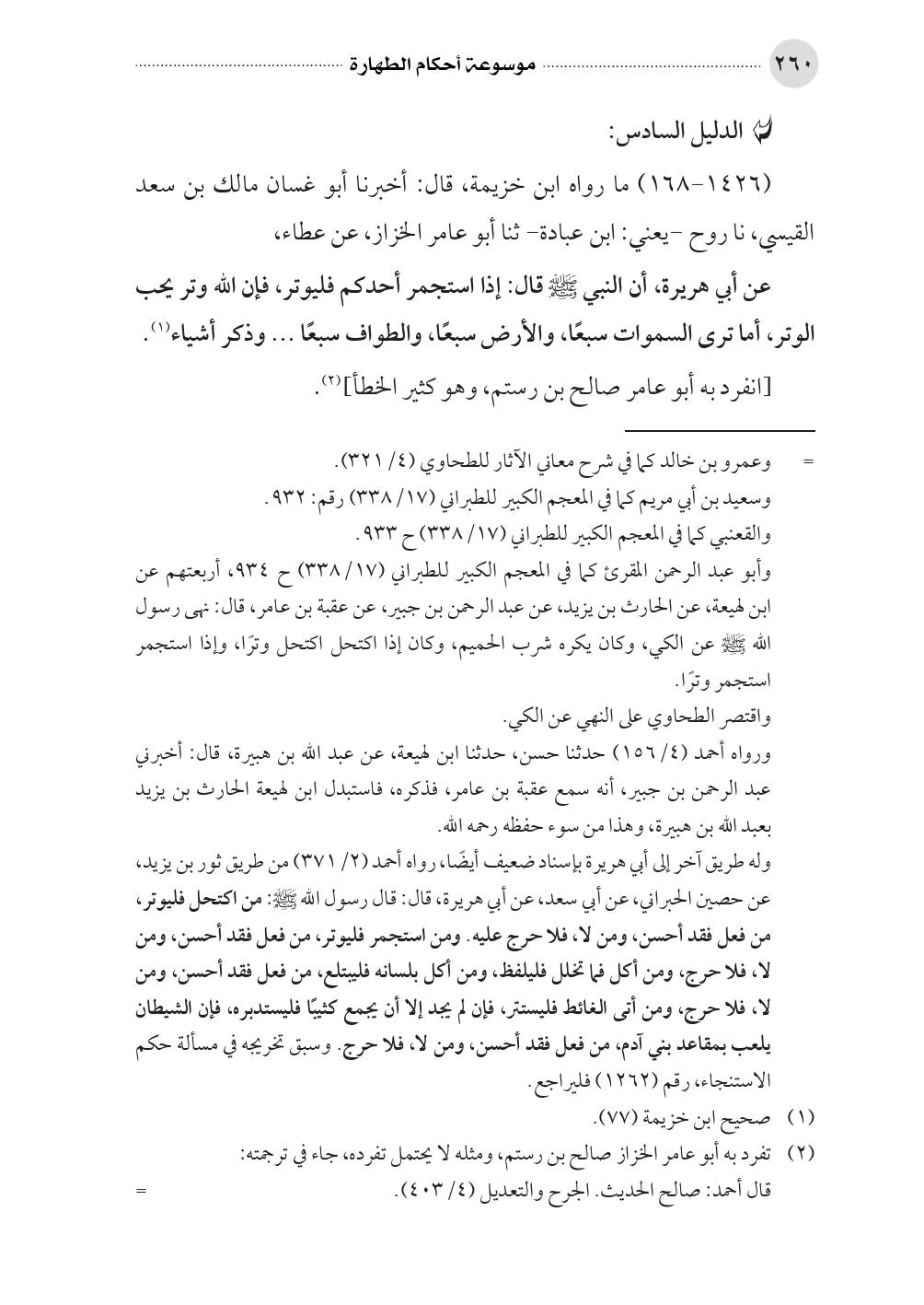 (١٤٢٦ - ١٦٨) ما رواه ابن خزيمة، قال: أخبرنا أبو غسان مالك بن سعد القيسي، نا روح -يعني: ابن عبادة- ثنا أبو عامر الخزاز، عن عطاء، عن أبي هريرة، أن النبي صلى الله عليه وسلم قال: إذا استجمر أحدكم فليوتر، فإن الله وتر يحب الوتر، أما ترى السموات سبعًا، والأرض سبعًا، والطواف سبعًا ... وذكر أشياء (¬١).