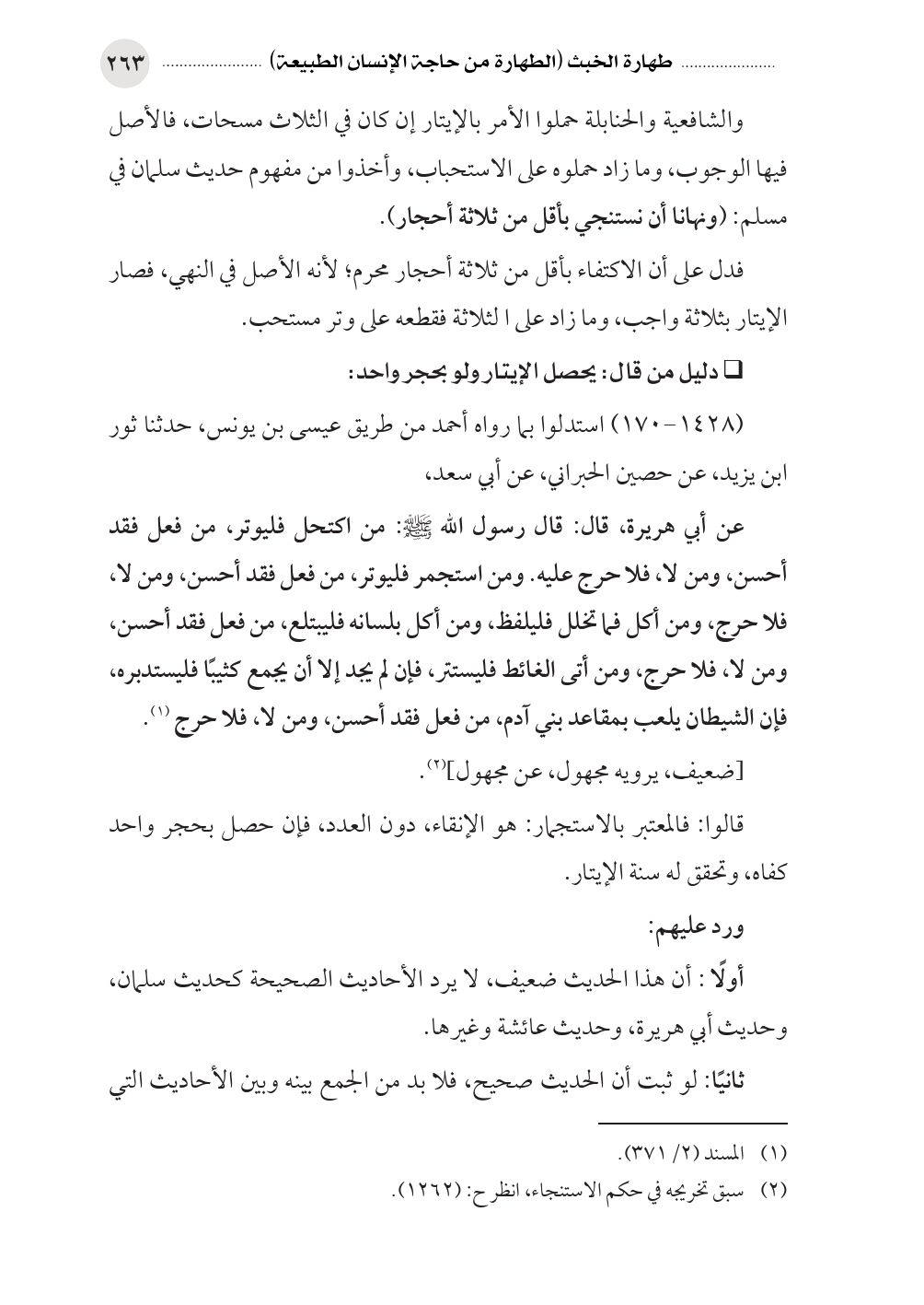 والشافعية والحنابلة حملوا الأمر بالإيتار إن كان في الثلاث مسحات، فالأصل فيها الوجوب، وما زاد حملوه على الاستحباب، وأخذوا من مفهوم حديث سلمان في مسلم: (ونهانا أن نستنجي بأقل من ثلاثة أحجار).