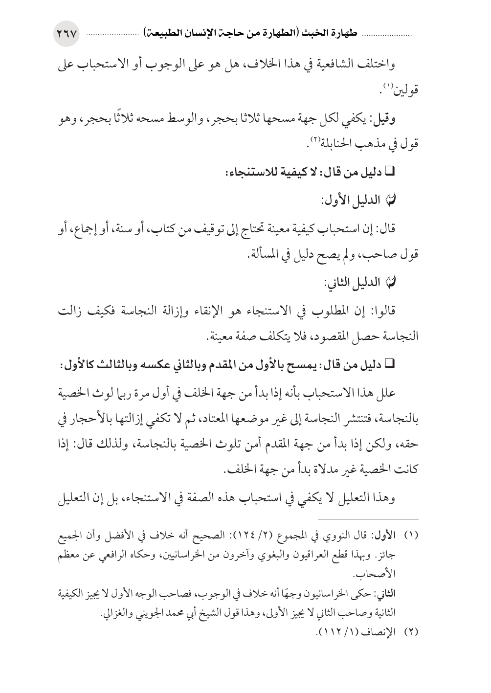 وقيل: يكفي لكل جهة مسحها ثلاثا بحجر، والوسط مسحه ثلاثًا بحجر، وهو قول في مذهب الحنابلة (¬٢).