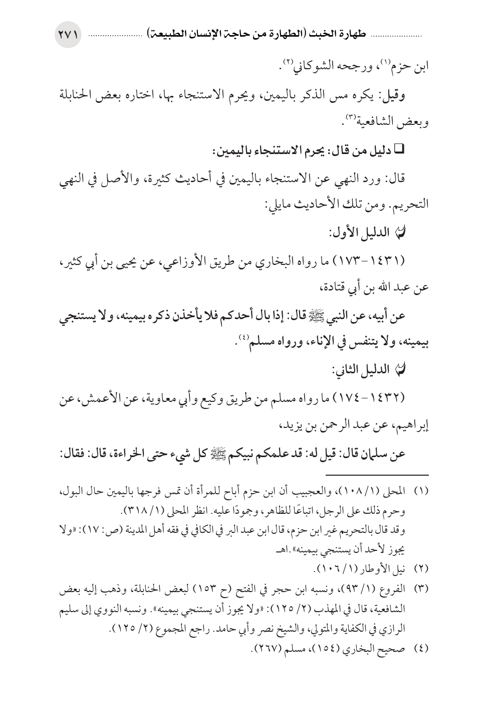 (¬٣) الفروع (١/ ٩٣)، ونسبه ابن حجر في الفتح (ح ١٥٣) لبعض الحنابلة، وذهب إليه بعض الشافعية، قال في المهذب (٢/ ١٢٥): «ولا يجوز أن يستنجي بيمينه». ونسبه النووي إلى سليم الرازي في الكفاية والمتولي، والشيخ نصر وأبي حامد. راجع المجموع (٢/ ١٢٥).