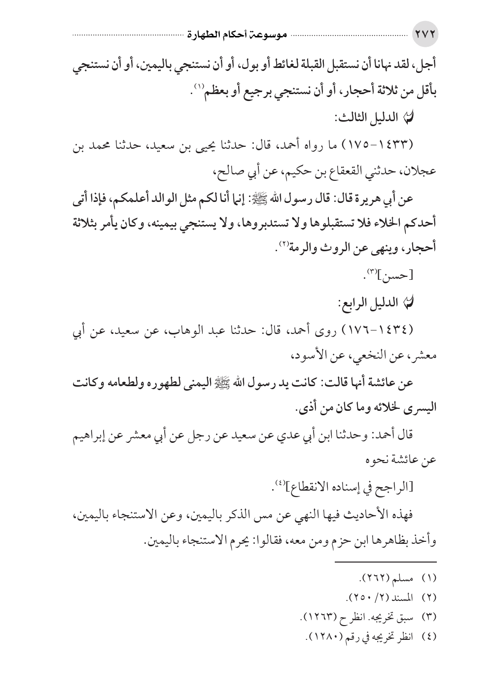 عن أبي هريرة قال: قال رسول الله صلى الله عليه وسلم: إنما أنا لكم مثل الوالد أعلمكم، فإذا أتى أحدكم الخلاء فلا تستقبلوها ولا تستدبروها، ولا يستنجي بيمينه، وكان يأمر بثلاثة أحجار، وينهى عن الروث والرمة (¬٢).