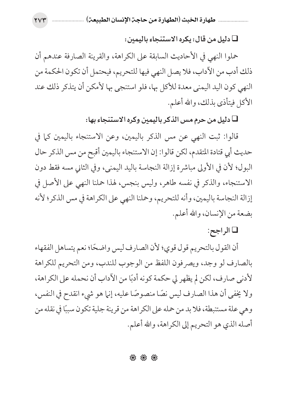 • دليل من حرم مس الذكر باليمين وكره الاستنجاء بها: