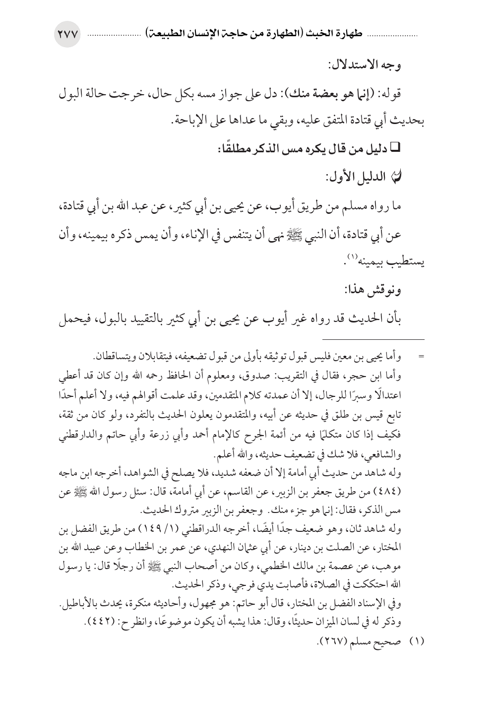 قوله: (إنما هو بعضة منك): دل على جواز مسه بكل حال، خرجت حالة البول بحديث أبي قتادة المتفق عليه، وبقي ما عداها على الإباحة.