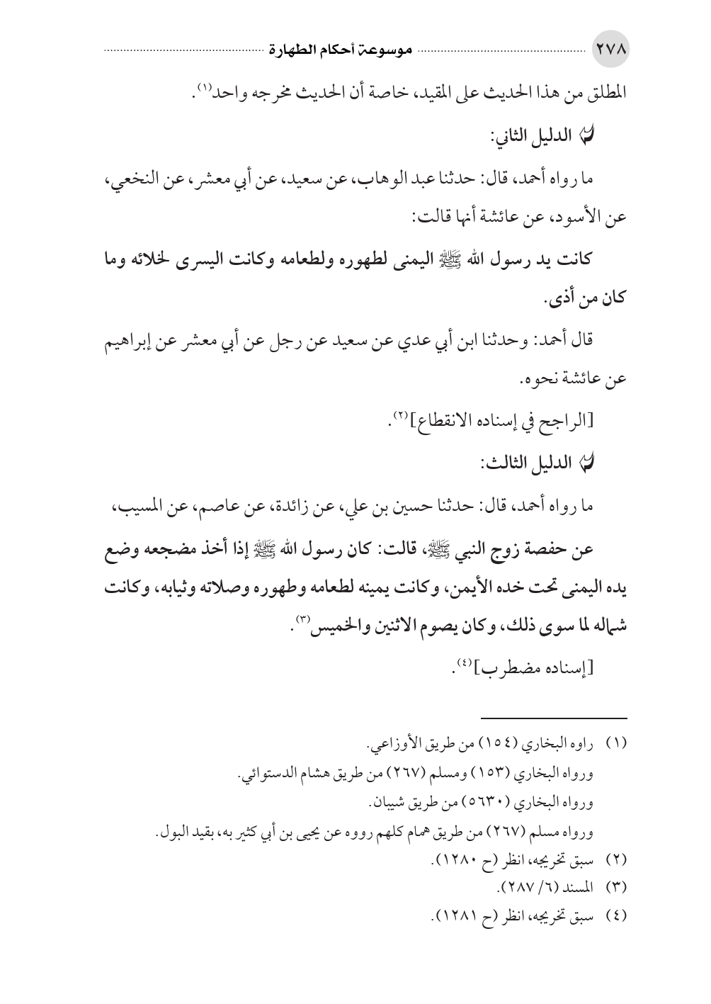 كانت يد رسول الله صلى الله عليه وسلم اليمنى لطهوره ولطعامه وكانت اليسرى لخلائه وما كان من أذى.