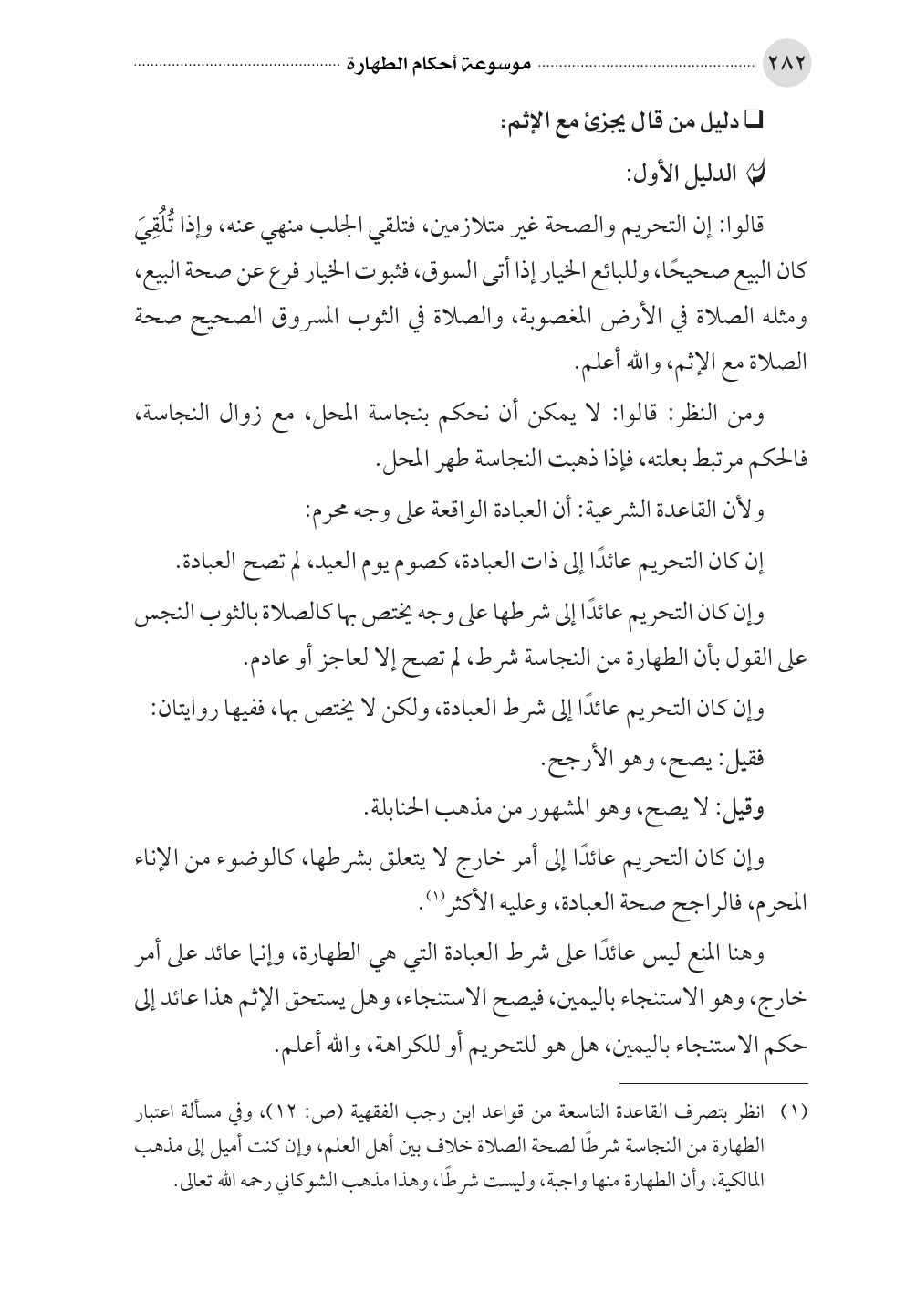 (¬١) انظر بتصرف القاعدة التاسعة من قواعد ابن رجب الفقهية (ص: ١٢)، وفي مسألة اعتبار الطهارة من النجاسة شرطًا لصحة الصلاة خلاف بين أهل العلم، وإن كنت أميل إلى مذهب المالكية، وأن الطهارة منها واجبة، وليست شرطًا، وهذا مذهب الشوكاني رحمه الله تعالى.