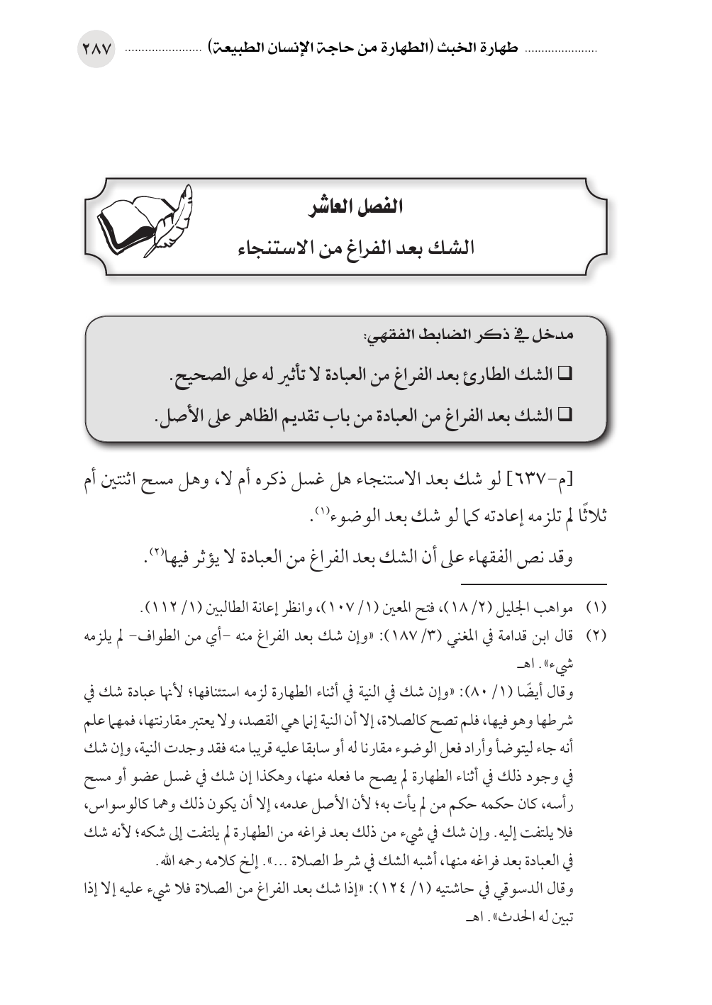 وقال أيضًا (١/ ٨٠): «وإن شك في النية في أثناء الطهارة لزمه استئنافها؛ لأنها عبادة شك في شرطها وهو فيها، فلم تصح كالصلاة، إلا أن النية إنما هي القصد، ولا يعتبر مقارنتها، فمهما علم أنه جاء ليتوضأ وأراد فعل الوضوء مقارنا له أو سابقا عليه قريبا منه فقد وجدت النية، وإن شك في وجود ذلك في أثناء الطهارة لم يصح ما فعله منها، وهكذا إن شك في غسل عضو أو مسح رأسه، كان حكمه حكم من لم يأت به؛ لأن الأصل عدمه، إلا أن يكون ذلك وهما كالوسواس، فلا يلتفت إليه. وإن شك في شيء من ذلك بعد فراغه من الطهارة لم يلتفت إلى شكه؛ لأنه شك في العبادة بعد فراغه منها، أشبه الشك في شرط الصلاة ... ». إلخ كلامه رحمه الله.