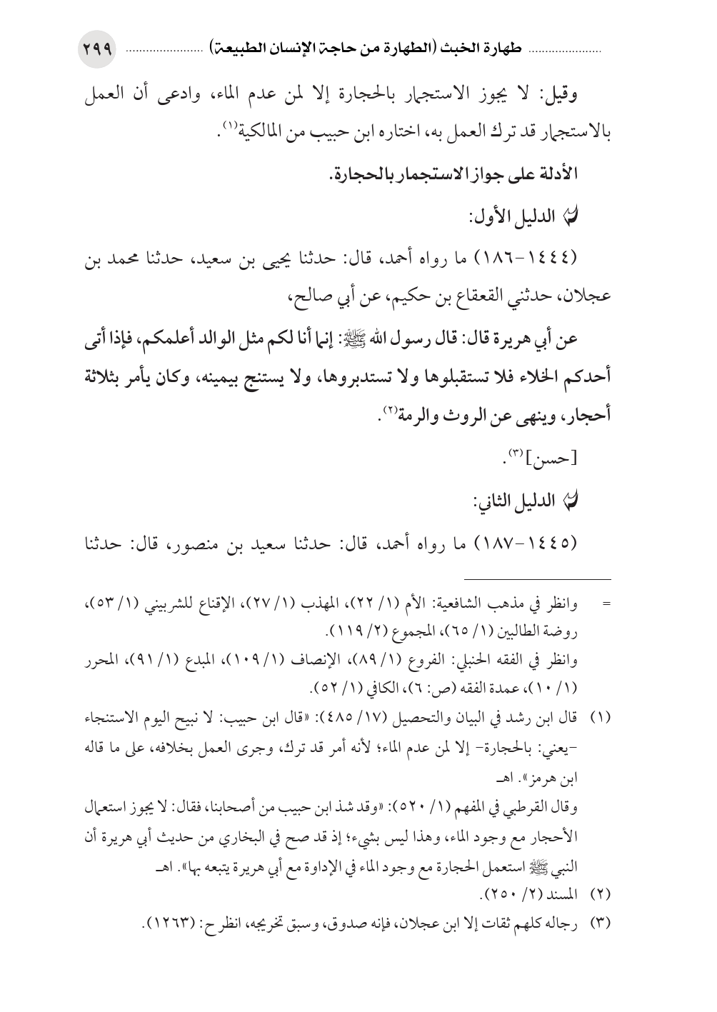 (¬١) قال ابن رشد في البيان والتحصيل (١٧/ ٤٨٥): «قال ابن حبيب: لا نبيح اليوم الاستنجاء -يعني: بالحجارة- إلا لمن عدم الماء؛ لأنه أمر قد ترك، وجرى العمل بخلافه، على ما قاله ابن هرمز». اهـ