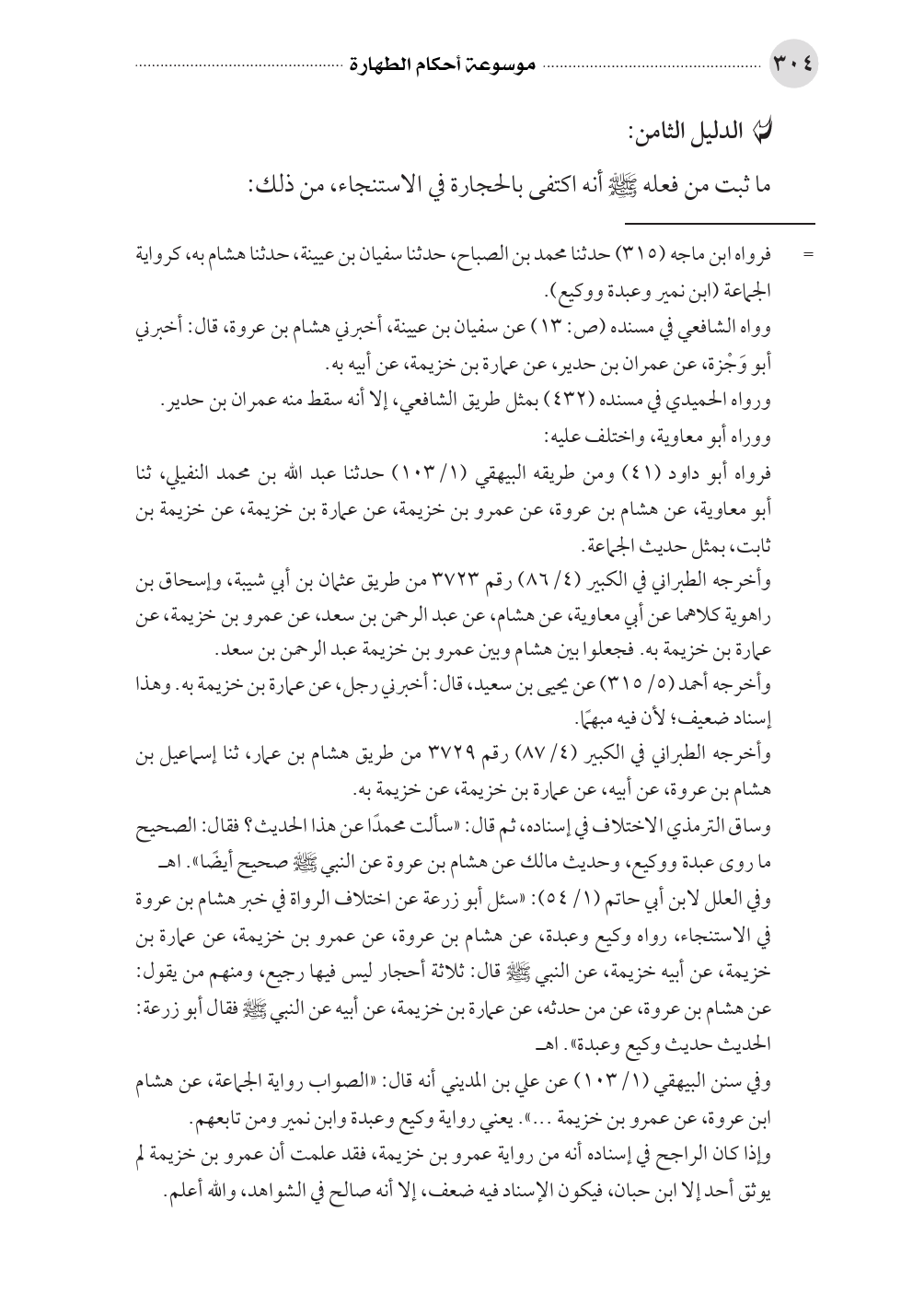 وفي سنن البيهقي (١/ ١٠٣) عن علي بن المديني أنه قال: «الصواب رواية الجماعة، عن هشام ابن عروة، عن عمرو بن خزيمة ... ». يعني رواية وكيع وعبدة وابن نمير ومن تابعهم.