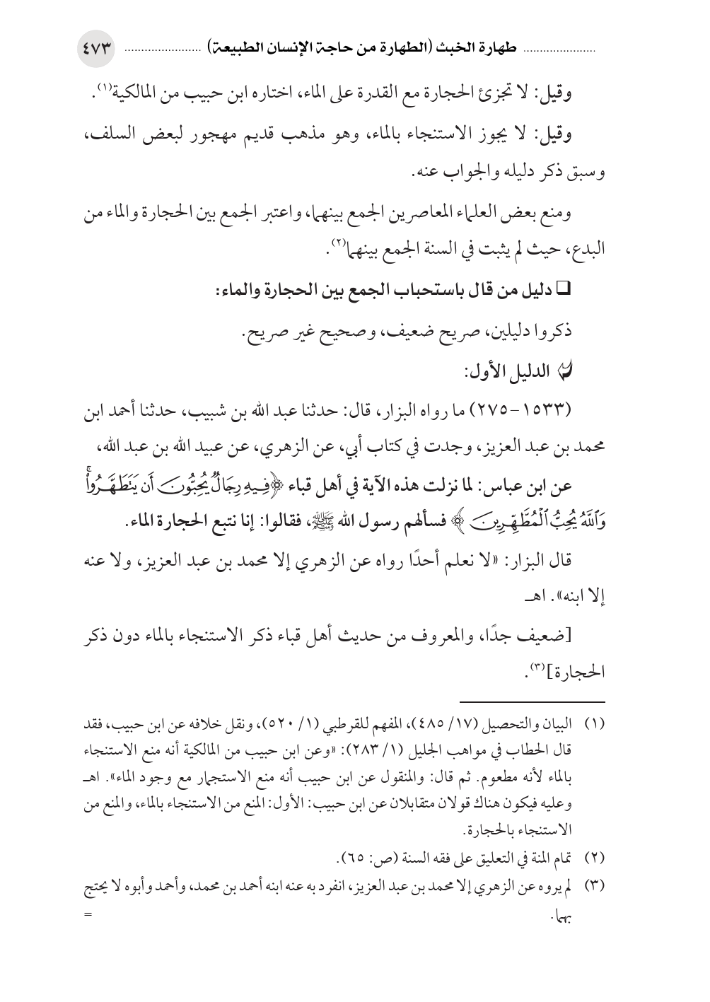 (¬١) البيان والتحصيل (١٧/ ٤٨٥)، المفهم للقرطبي (١/ ٥٢٠)، ونقل خلافه عن ابن حبيب، فقد قال الحطاب في مواهب الجليل (١/ ٢٨٣): «وعن ابن حبيب من المالكية أنه منع الاستنجاء بالماء لأنه مطعوم. ثم قال: والمنقول عن ابن حبيب أنه منع الاستجمار مع وجود الماء». اهـ وعليه فيكون هناك قولان متقابلان عن ابن حبيب: الأول: المنع من الاستنجاء بالماء، والمنع من الاستنجاء بالحجارة.