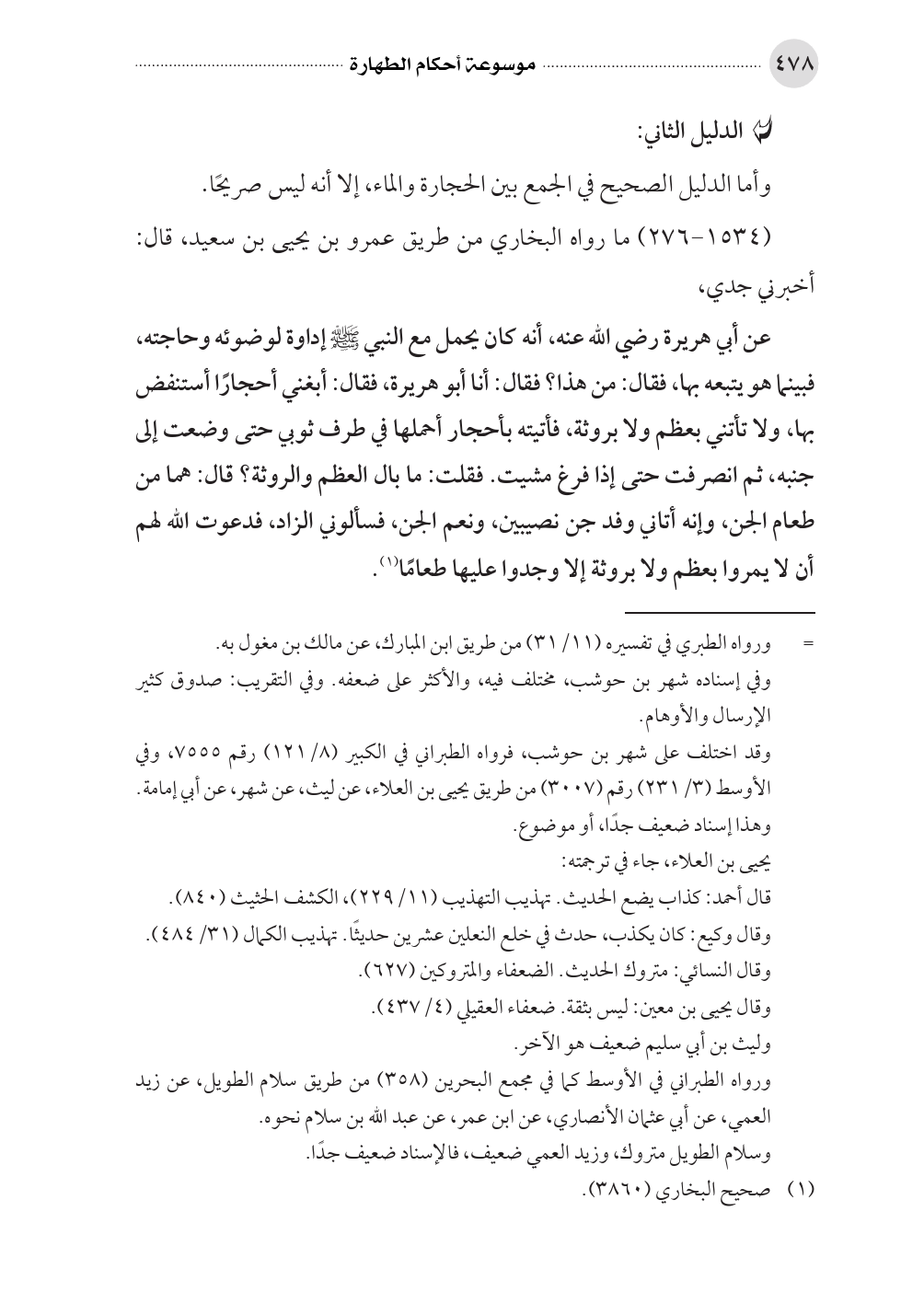 وأما الدليل الصحيح في الجمع بين الحجارة والماء، إلا أنه ليس صريحًا.