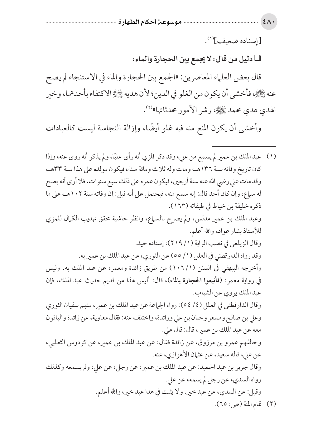 قال بعض العلماء المعاصرين: «الجمع بين الحجارة والماء في الاستنجاء لم يصح عنه صلى الله عليه وسلم، فأخشى أن يكون من الغلو في الدين؛ لأن هديه صلى الله عليه وسلم الاكتفاء بأحدهما، وخير الهدي هدي محمد صلى الله عليه وسلم، وشر الأمور محدثاتها» (¬٢).
