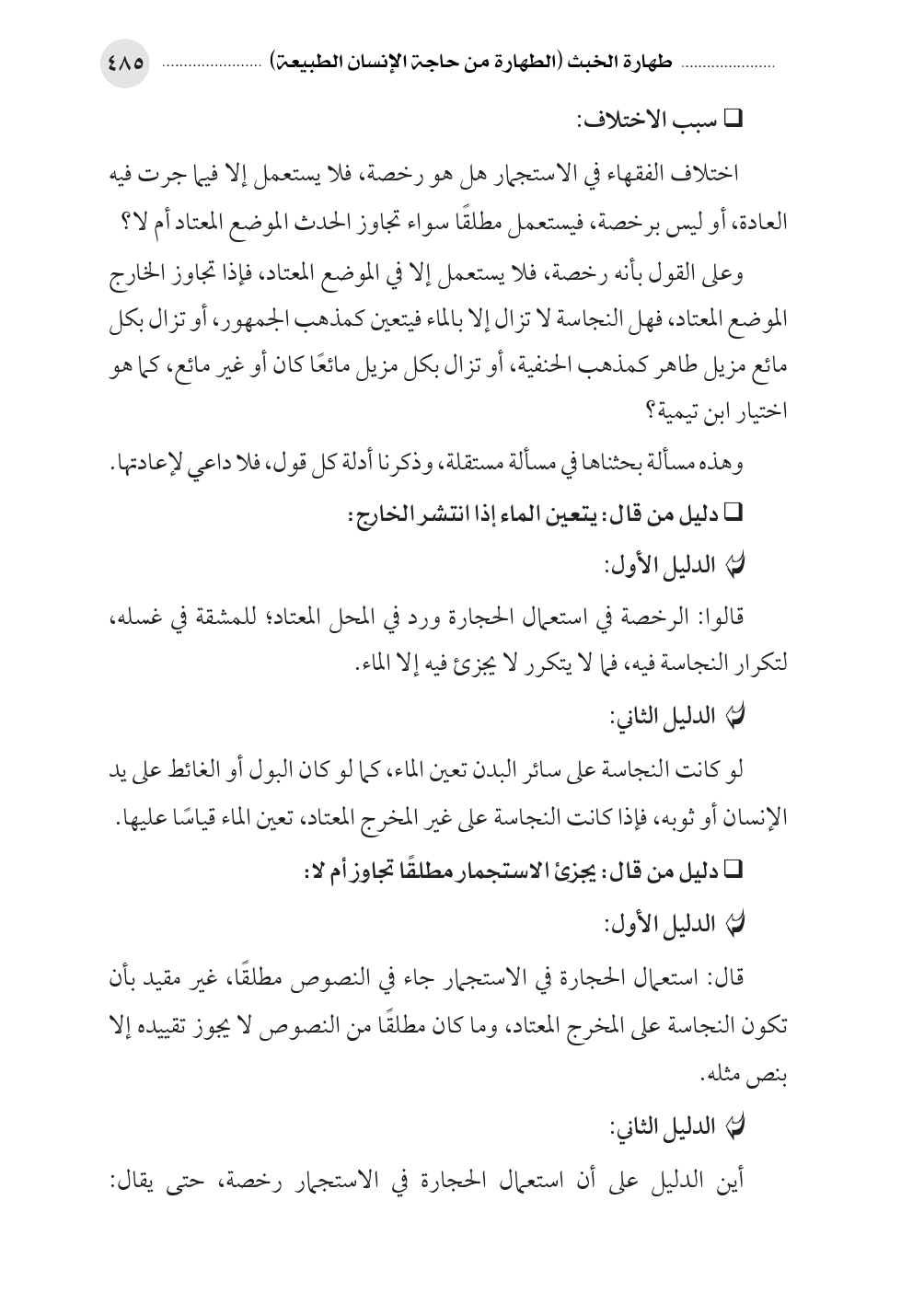 قال: استعمال الحجارة في الاستجمار جاء في النصوص مطلقًا، غير مقيد بأن تكون النجاسة على المخرج المعتاد، وما كان مطلقًا من النصوص لا يجوز تقييده إلا بنص مثله.