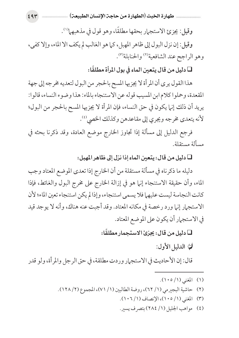 هذا القول يرى أن المرأة لا يجزيها المسح بالحجر من البول لتعديه مخرجه إلى جهة المقعدة، وحملوا كلام ابن المسيب قوله عن الاستنجاء بالماء: هذا وضوء النساء، قالوا: يريد أن ذلك إنما يكون في حق النساء، فإن المرأة لا يجزيها المسح بالحجر من البول؛ لأنه يتعدى مخرجه ويجري إلى مقاعدهن وكذلك الخصي (¬٤).