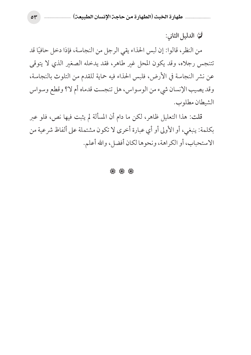 من النظر، قالوا: إن لبس الحذاء يقي الرجل من النجاسة، فإذا دخل حافيًا قد تتنجس رجلاه، وقد يكون المحل غير طاهر، فقد يدخله الصغير الذي لا يتوقى عن نشر النجاسة في الأرض، فلبس الحذاء فيه حماية للقدم من التلوث بالنجاسة، وقد يصيب الإنسان شيء من الوسواس، هل تنجست قدماه أم لا؟ وقطع وسواس الشيطان مطلوب.