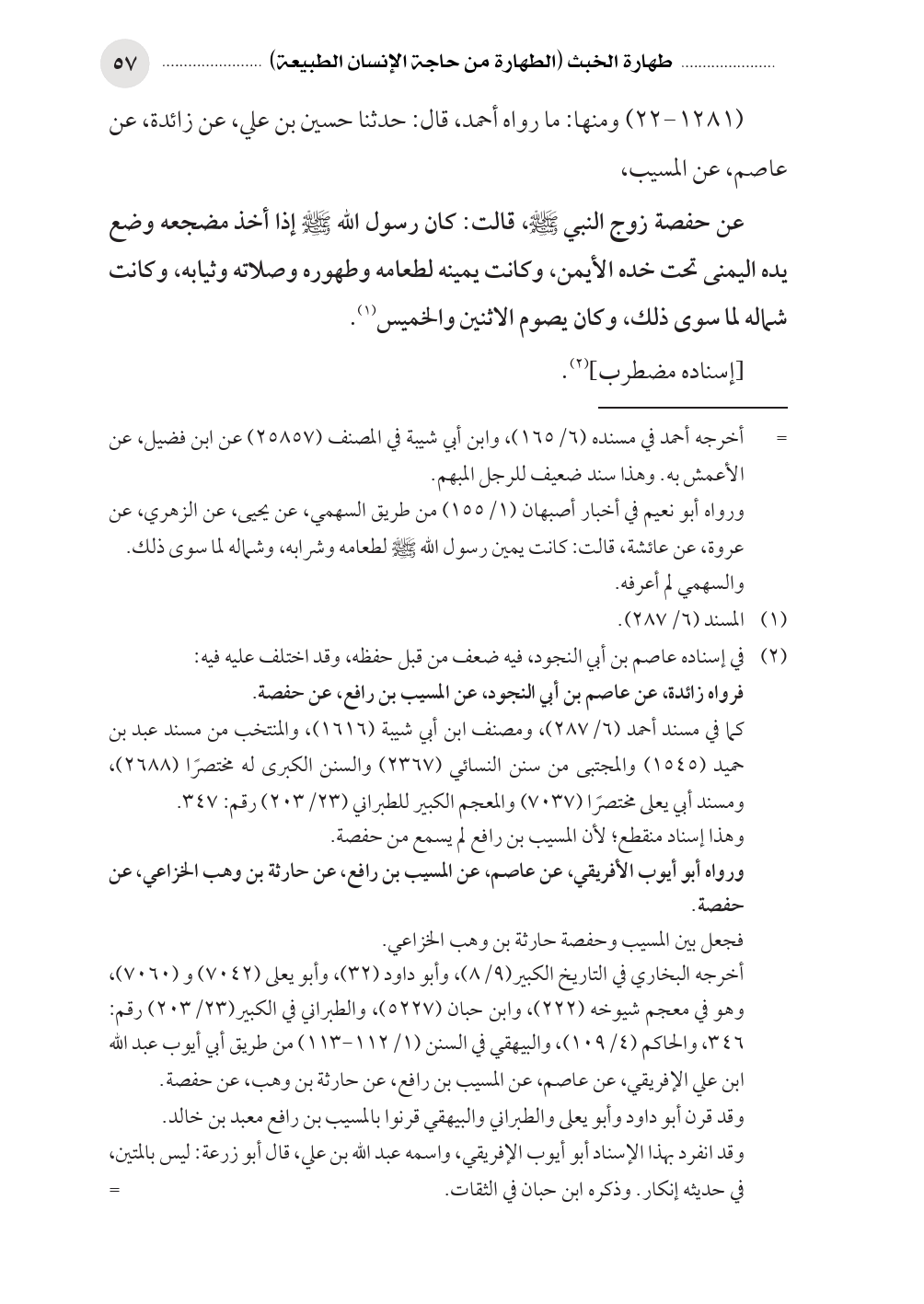 أخرجه البخاري في التاريخ الكبير (٩/ ٨)، وأبو داود (٣٢)، وأبو يعلى (٧٠٤٢) و (٧٠٦٠)، وهو في معجم شيوخه (٢٢٢)، وابن حبان (٥٢٢٧)، والطبراني في الكبير (٢٣/ ٢٠٣) رقم: ٣٤٦، والحاكم (٤/ ١٠٩)، والبيهقي في السنن (١/ ١١٢ - ١١٣) من طريق أبي أيوب عبد الله ابن علي الإفريقي، عن عاصم، عن المسيب بن رافع، عن حارثة بن وهب، عن حفصة.