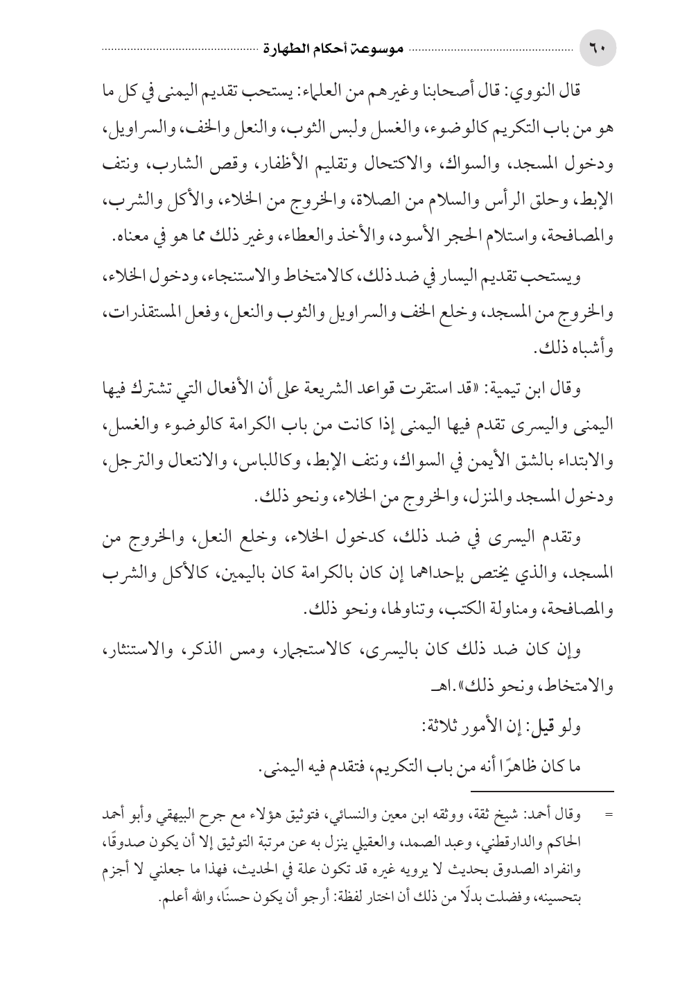 قال النووي: قال أصحابنا وغيرهم من العلماء: يستحب تقديم اليمنى في كل ما هو من باب التكريم كالوضوء، والغسل ولبس الثوب، والنعل والخف، والسراويل، ودخول المسجد، والسواك، والاكتحال وتقليم الأظفار، وقص الشارب، ونتف الإبط، وحلق الرأس والسلام من الصلاة، والخروج من الخلاء، والأكل والشرب، والمصافحة، واستلام الحجر الأسود، والأخذ والعطاء، وغير ذلك مما هو في معناه.