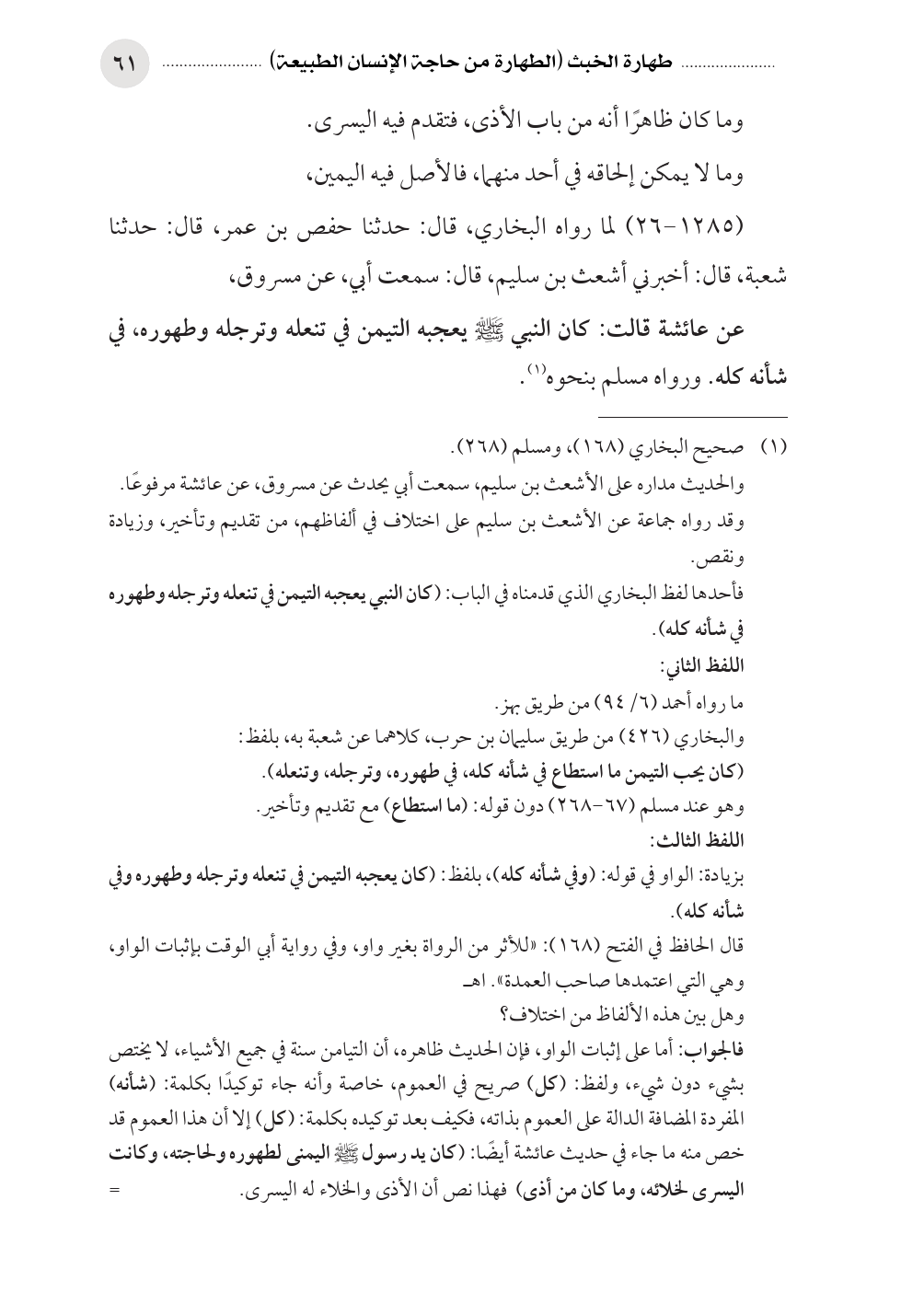 فالجواب: أما على إثبات الواو، فإن الحديث ظاهره، أن التيامن سنة في جميع الأشياء، لا يختص بشيء دون شيء، ولفظ: (كل) صريح في العموم، خاصة وأنه جاء توكيدًا بكلمة: (شأنه) المفردة المضافة الدالة على العموم بذاته، فكيف بعد توكيده بكلمة: (كل) إلا أن هذا العموم قد خص منه ما جاء في حديث عائشة أيضًا: (كان يد رسول صلى الله عليه وسلم اليمنى لطهوره ولحاجته، وكانت اليسرى لخلائه، وما كان من أذى) فهذا نص أن الأذى والخلاء له اليسرى. ...