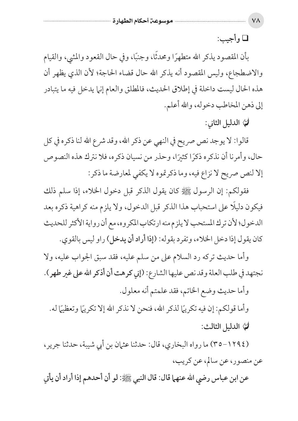 وأما حديث تركه رد السلام على من سلم عليه، فقد سبق الجواب عليه، ولا نجتهد في طلب العلة وقد نص عليها الشارع: (إني كرهت أن أذكر الله على غير طهر).