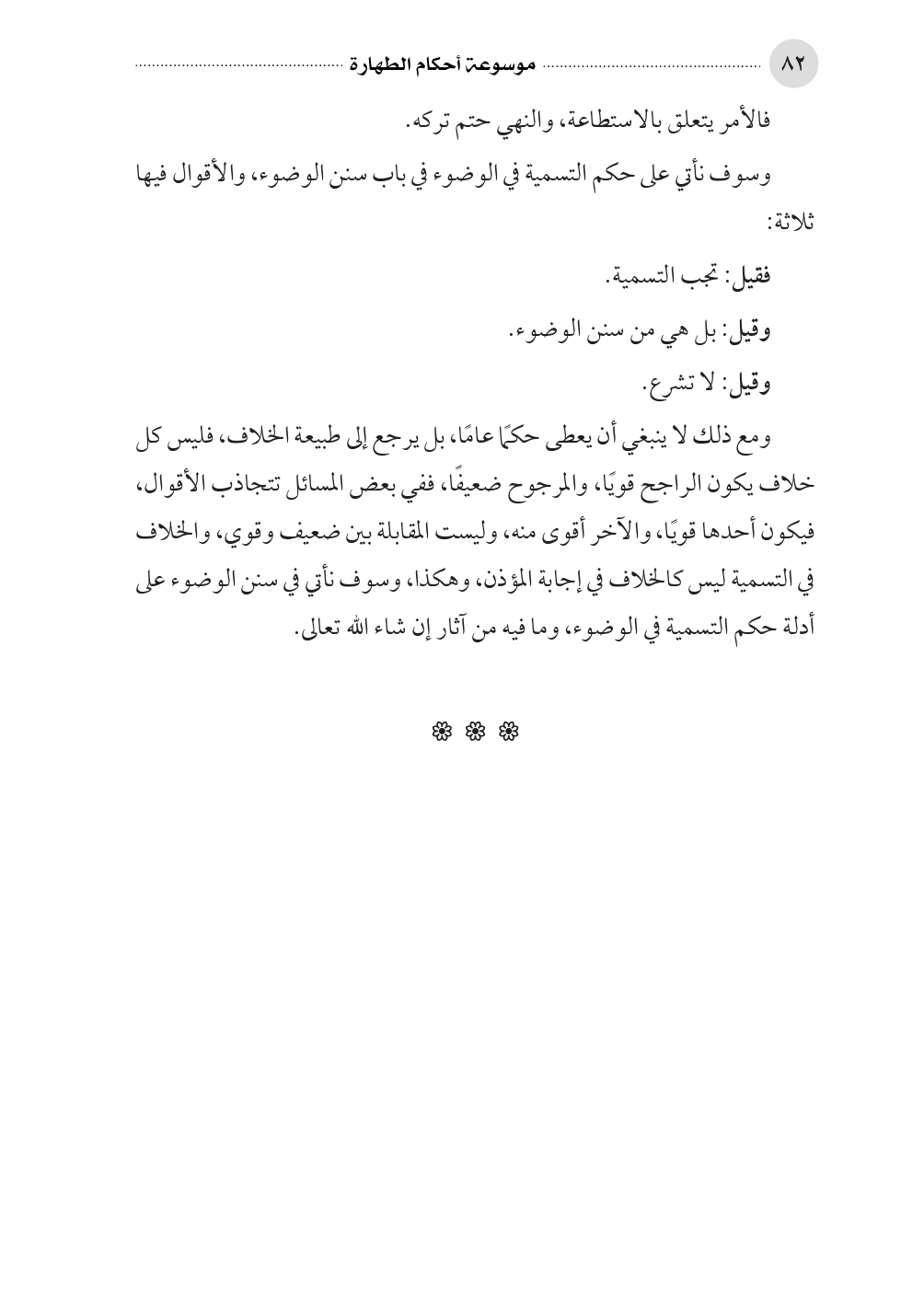 ومع ذلك لا ينبغي أن يعطى حكمًا عامًا، بل يرجع إلى طبيعة الخلاف، فليس كل خلاف يكون الراجح قويًا، والمرجوح ضعيفًا، ففي بعض المسائل تتجاذب الأقوال، فيكون أحدها قويًا، والآخر أقوى منه، وليست المقابلة بين ضعيف وقوي، والخلاف في التسمية ليس كالخلاف في إجابة المؤذن، وهكذا، وسوف نأتي في سنن الوضوء على أدلة حكم التسمية في الوضوء، وما فيه من آثار إن شاء الله تعالى.