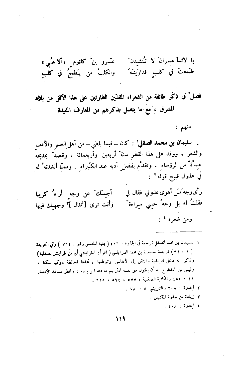 سليمان بن محمد الصقلي: كان - فيما بلغني - من أهل العلم والأدب والشعر؛ ووفد على هذا القطر سنة أربعين وأربعمائة، وقصد بمديحه عدة من الرؤساء، وتقدم بفضل أدبه عند الكبراء، ووما أنشدته له في عذول قبيح قوله: