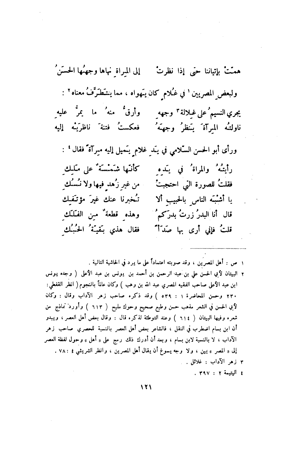 هممت بإتياننا حتى إذا نظرت ... إلى المرآة نهاها وجهها الحسن ولبعض المصريين في غلام كان يهواه، مما يتطرف معناه: