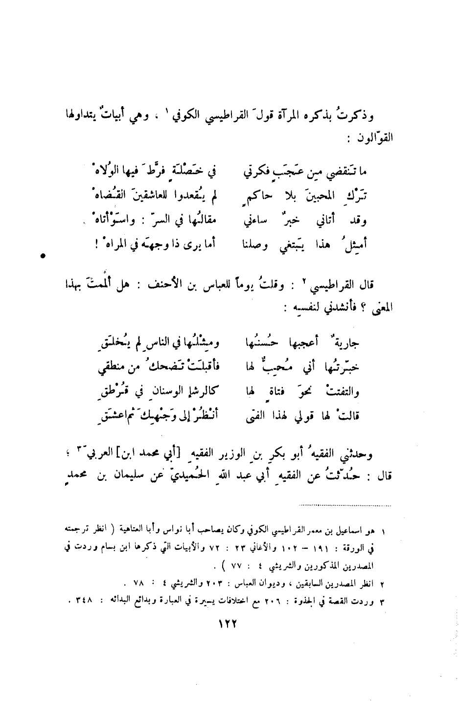 أمثل هذا يبتغي وصلنا ... أما يرى ذا وجهه في المراه! قال القراطيسي: وقلت يوماً للعباس بن الأحنف: هل ألممت بهذا المعنى - فأنشدني لنفسه: