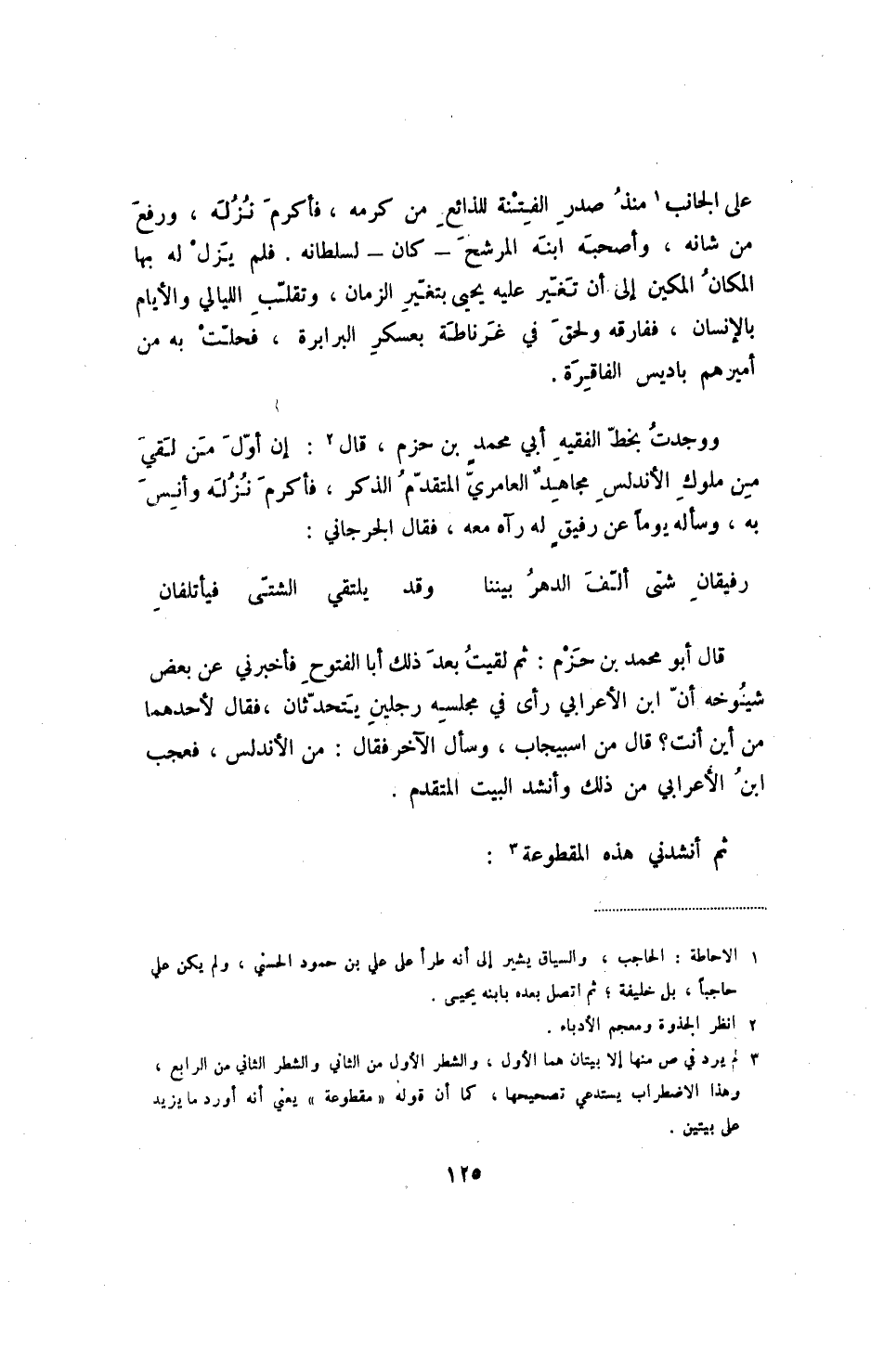 ووجدت بخط الفقيه أبي محمد بن حزم، قال: إن أول من لقي من ملوك الأندلس مجاهد العامري المتقدم الذكر، فأكرم نزله وأنس به، وسأله يوماً عن رفيق له رآه معه، فقال الجرجاني: