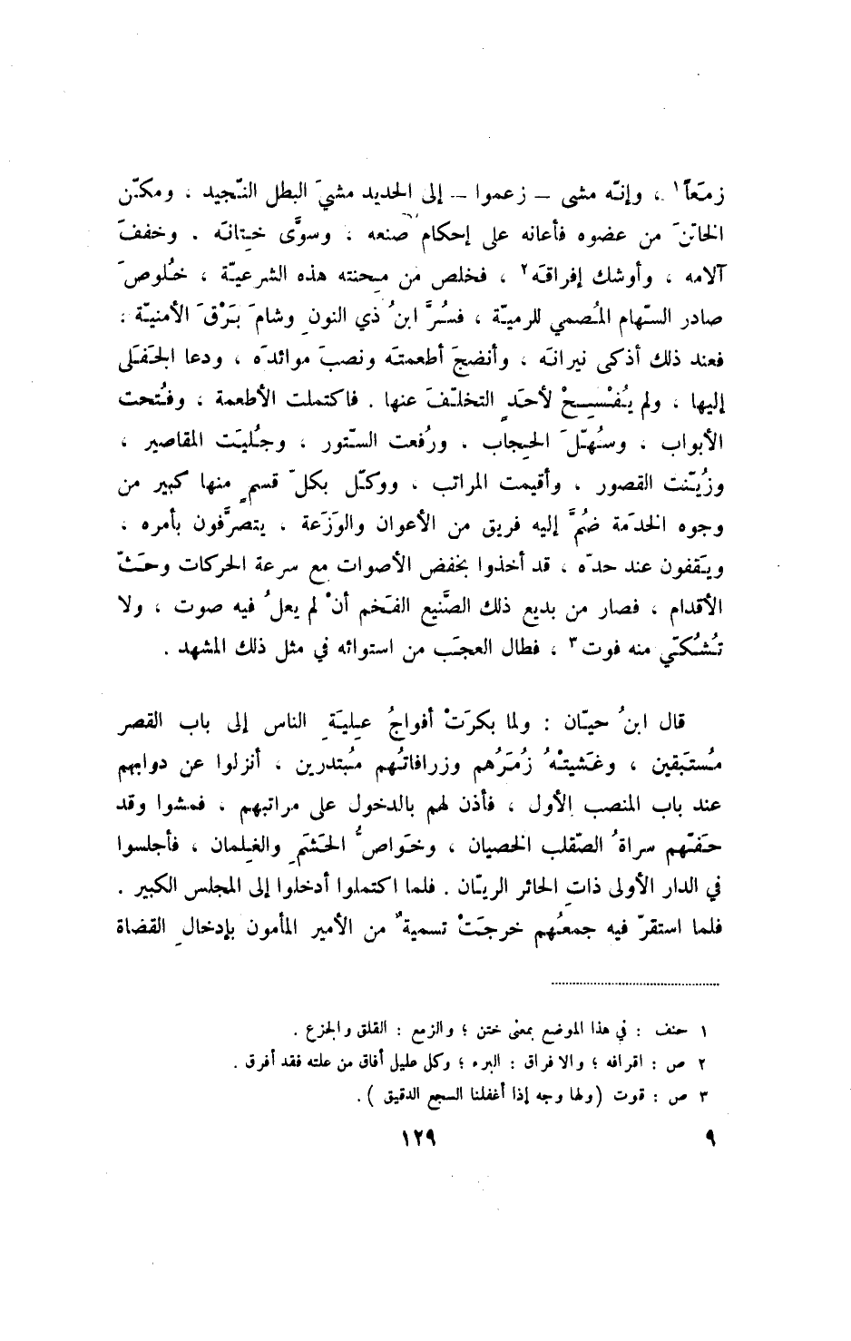 زمعاً، وإنه مشى - زعموا - إلى الحديد مشي البطل النجيد، ومكن الخاتن من عضوه فأعانه على إحكام صنعه، وسوى ختانه، وخفف آلامه، وأوشك إفراقه، فخلص من محنته هذه الشرعية، خلوص صادر السهام المصمي للرمية، فسر ابن ذي النون وشام برق الأمنية، فعند ذلك أذكى نيرانه، وأنضج أطعمته ونصب موائده، ودعا الجفلى إليها، ولم يفسح لأحد التخلف عنها. فاكتملت الأطعمة، وفتحت الأبواب، وسهل الحجاب، ورفعت الستور، وجليت المقاصير، وزينت القصور، واقيمت المراتب، ووكل بكل قسم منها كبير من وجوه الخدمة ضم إليه فريق من الأعوان والوزعة، يتصرفون بأمره، ويقفون عند حده، قد أخذوا بخفض الأصوات مع سرعة الحركات وحث الأقدام، فصار من بديع ذلك الصنيع الفخم أن لم يعل فيه صوت، ولا تشكي منه فوت، فطال العجب من استوائه في مثل ذلك المشهد.