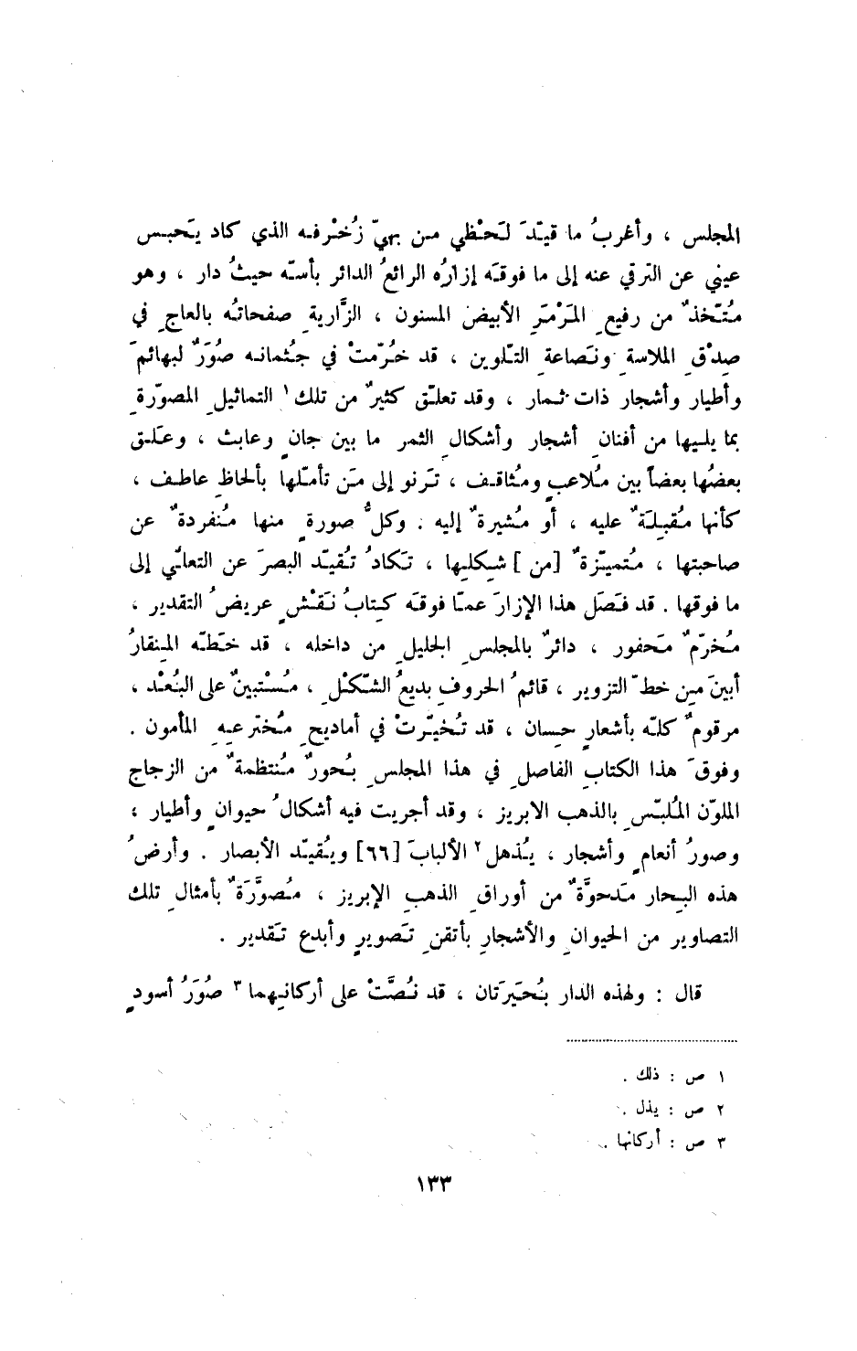 المجلس، وأغرب ما قيد لحظي من بهي زخرفه الذي كاد يحبس عيني عن الترقي عنه إلى ما فوقه إزاره الرائع الدائر باسمه حيث دار، وهو متخذ من رفيع المرمر الأبيض المسنون، الزارية صفحاته بالعاج في صدق الملاسة ونصاعة التلوين، قد خرمت في جثمانه صور لبهائم وأطيار وأشجار ذات ثمار، وقد تعلق كثير من تلك التماثيل المصور بما يليها من أفنان أشجار وأشكال الثمر ما بين جان وعابث، وعلق بعضها بعضاً بين ملاعب ومثاقف، ترنو إلى من تأملها بألحاظ عاطف، كأنها مقبلة عليه، أو مشيرة إليه. وكل صورة منها منفردة عن صاحبتها، متميزة [من] شكلها، تكاد تقيد البصر عن التعلي إلى ما فوقها. قد فصل هذا الإزار عما فوقه كتاب نقش عريض التقدير، مخرم محفور، دائر بالمجلس الجليل من داخله، قد خطه المنقار أبين من خط التزوير، قائم الحروف بديع الشكل، مستبين على البعد، مرقوم كله بأشعار حسان، قد تخيرت في أماديح مخترعه المأمون. وفوق هذا الكتاب الفاصل في هذا المجلس بحور منتظمة من الزجاج الملون الملبس بالذهب الأبريز، وقد أجريت فيه أشكال حيوان وأطيار، وصور أنعام وأشجار، يذهل الألباب [66] ويقيد الأبصار. وأرض هذه البحار مدحوة من أوراق الذهب الإبريز، مصورة بأمثال تلك التصاوير من الحيوان والأشجار بأتقن تصوير وأبدع تقدير.