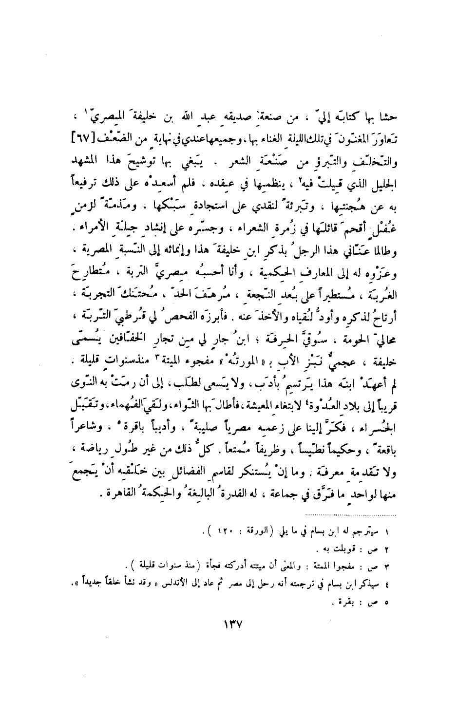 حشا بها كتابه إليّ، من صنعة صديقه عبد الله بن خليفة المصري. تعاور المغنون في تلك الليلة الغناء بها، وجميعها عندي في نهاية من الضعف [67] والتخلف والتبرؤ من صنعة الشعر، يبغي بها توشيح هذا المشهد الجليل الذي قيلت فيه، ينظمها في عقده، فلم أسعده على ذلك ترفيعاً به عن هجنتها، وتبرئةً لنقدي على استجادة سبكها، ومذمة لزمن غفل أقحم قائلها في زمرة الشعراء، وجسره على إنشاد جلة الأمراء، وطالما عناني هذا الرجل بذكر ابن خليفة هذا وإنمائه إلى النسبة المصرية، وعزوه له إلى المعارف الحكمية، وأنا أحسبه مصري التربة، متطارح الغربة، مستطيراً على بعد النجعة، مرهف الحد، محتنك التجربة، أرتاح لذكره وأود لقياه والأخذ عنه. فأبرزه الفحص لي قطربي التربة، محالي الحومة، سوقي الحرفة؛ ابن جار لي من تجار الخفافين يسمى هليفة، عجمي نبز الأب ب - " المورته " مفجوء الميتة منذ سنوات قليلة. لم أعهد ابنه هذا يرتسم بأدب، ولا يسعى لطلب، إلى أن رمت به النوى قريباً إلى بلاد العدوة لابتغاء المعيشة، فأطال بها الثواء، ولقي الفهماء، وتقيل الجسراء، فكسر إلينا على زعمه مصرياً صليبة، وأديباً باقرة، وشاعراً باقعةً، وحكيماً نطيساً، وظريفاً ممتعاً. كل ذلك من غير طول رياضة، ولا تقدمة معرفة. وما إن يستنكر لقاسم الفضائل بين خلقه أن يجمع منها لواحد ما فرق في جماعة، له القدرة البالغة والحكمة القاهرة.