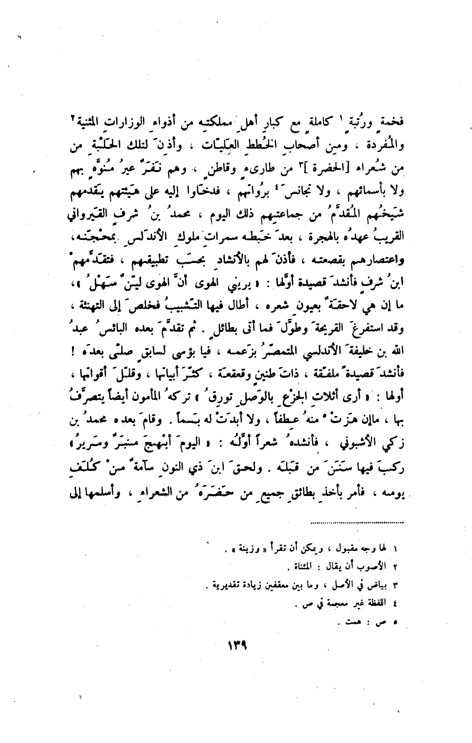 فخمة ورتبة كاملة مع كبار أهل مملكته من أذواء الوزارات المثنية والمفردة، ومن أصحاب الخطط العليات، وأذن لتلك الحلبة من شعراء [الحضرة] من طارئ وقاطن، وهم نفر عير منوه بهم ولا بأسمائهم، ولا تجانس برواتهم، فدخلوا إليه على هيئتهم يقدمهم شيخهم المقدم من جماعتهم ذلك اليوم، محمد بن شرف القيرواني القريب عهده بالهجرة، بعد خبطعه سمرات ملوك الأندلس بمحجنه، واعتصارهم بقصعته، فأذن لهم بالإنشاد بحسب تطبيقهم، فتقدمهم ابن شرف فأنشد قصيدة أولها: " يريني الهوى أن الهوى لين سهل "، ما إن هي لاحقة بعيون شعره، أطال فيها التشبيب فخلص إلى التهنئة، وقد استفرغ القريحة وطول فما أتى بطائل. ثم تقدم بعد البائس عبد الله بن خليفة الأندلسي المتمصر بزعمه، فيا بؤسى لسابق صلى بعده! فأنشد قصيدة ملفقة، ذات طنين وقعقعة، كثر أبياتها، وقلل أقواتها، أولها: " أرى أثلاث الجوع بالوصل تورق " تركه المأمون أيضاً يتصرف بها، ما إن هزت منه عطاً، ولا أبدت له بسماً. وقام بعده محمد بن زكي الأشبوني، فأنشده شعراً أوله: " اليوم أبهج منبر وسرير " ركب فيها سنن من قبله، ولحق ابن ذي النون سآمة من كلف يومه، فأمر بأخذ بطائق جميع من حضره من الشعراء، وأسلمها إلى
