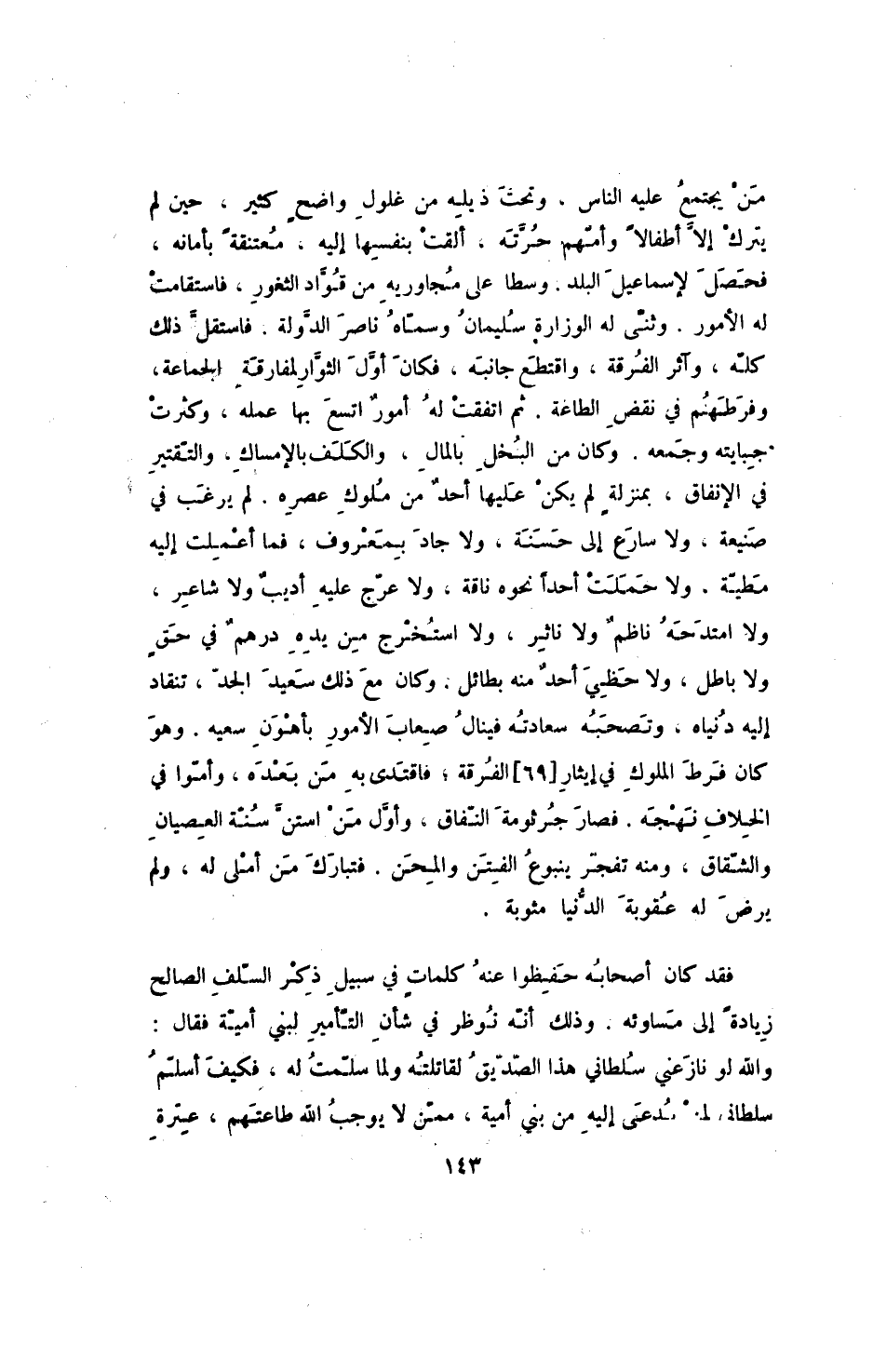 من يجتمع عليه الناس، وتحت ذيله من غلول واضح كثير، حين لم يترك إلا أطفالاً وأمهم حرته، ألقت بنفسها إليه، معتنقة بأمانه، فحصل لإسماعيل البلد. وسطا على مجاوريه من قواد الثغور، فاستقامت له الأمور. وثنى له الوزارة سليمان وسماه ناصر الدولة. فاستقل ذلك كله، وآثر الفرقة، واقتطع جانبه، فكان أول الثوار لمفارقة الجماعة، وفرطهم في نقض الطاعة، ثم اتفقت له أمور اتسع بها عمله، وكثرت جبايته وجمعه. وكان من البخل بالمال، والكلف بالإمساك، والتقتير في الإنفاق، بمنزلة لم يكن عليها أحد من ملوك عصره. لم يرغب في صنيعة، ولا سارع إلى حسنة، ولا جاد بمعروف، فما أعملت إليه مطية، ولا حملت أحداً نحوه ناقة، ولا عرج عليه أديب ولا شاعر، ولا امتدحه ناظم ولا ناثر، ولا استخرج من يده درهم في حق ولا باطل، ولا حظي أحد منه بطائل. وكان مع ذلك سعيد الجد، تنقاد إليه دنياه، وتصحبه سعادته فينال صعاب الأمور بأهون سعيه. وهو كان فرط الملوك في إيثار [69] الفرقة؛ فاقتدى به من بعده، وأموا في الخلاف نعهجه. فصار جرثومة النفاق، وأول من استن سنة العصيان والشقاق، ومنه تفجر ينبوع الفتن والمحن، فتبارك من أملى له، ولم يرض له عقوبة الدنيا مثوبة.