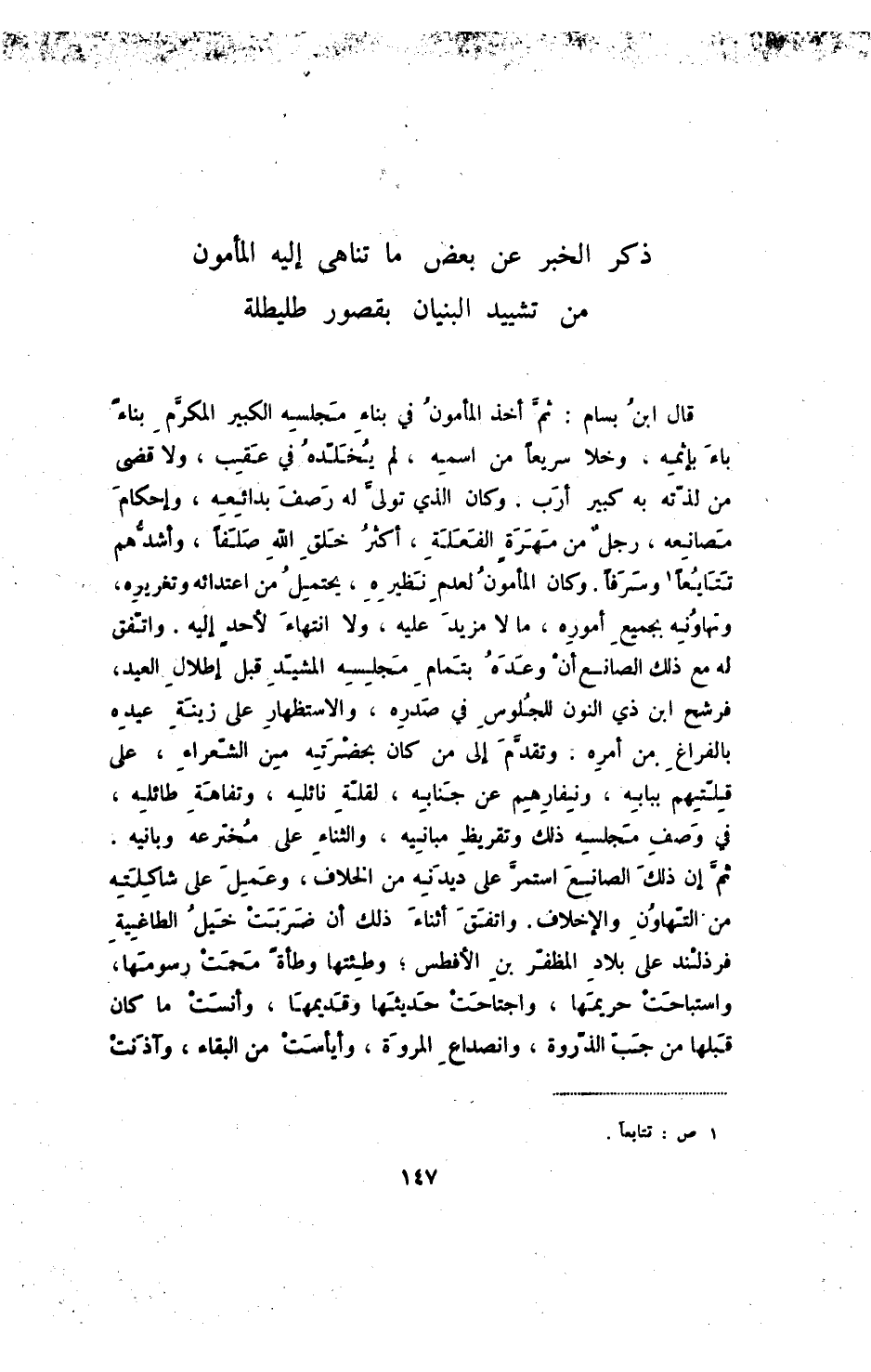 قال ابن بسام: ثم أخذ المأمون في بناء مجلسه الكبير المكرم بناءً باء بإثمه، وخلا سريعاً من اسمه، لم يخلده في عقب، ولا قضى من لذته به كبير أرب، وكان الذي تولى له رصف بدائعه، وإحكام مصانعه، رجل من مهرة الفعلة، أكثر خلق الله صلفاً، وأشدهم تتايعا وسرفاً. وكان المأمون لعدم نظيره، يحتمل من اعتدائه وتغيريه، وتهاونه بجميع أموره، ما لا مزيد عليه، ولا انتهاء لأحد إليه. واتفق له مع ذلك الصانع أن وعده بتمام مجلسه المشيد قبل إطلال العيد، فرشح ابن ذي النون للجلوس في صدره، والاستظهار على زينة عيده بالفراغ من أمره، وتقدم إلى من كان بحضرته من الشعراء، على قلتهم ببابه، ونفارهم عن جنابه، لقلة نائله، وتفاهة طائله، في وصف مجلسه ذلك وتقريظ مبانيه، والثناء على مخترعه وبانيه، ثم إن ذلك الصانع استمر على ديدنه من الخلاف، وعمل على شاكلته من التهاون والإخلاف. واتفق أثناء ذلك أن ضربت خيل الطاغية فرذلند على بلاد المظفر بن الأفطس؛ وطئتها وطأة محت رسومها، واستباحت حريمها، واجتاحت حديثها وقديمها، وأنست ما كان قبلها من جب الذروة، وانصداع المروة، وأيأست من البقاء، وآذنت