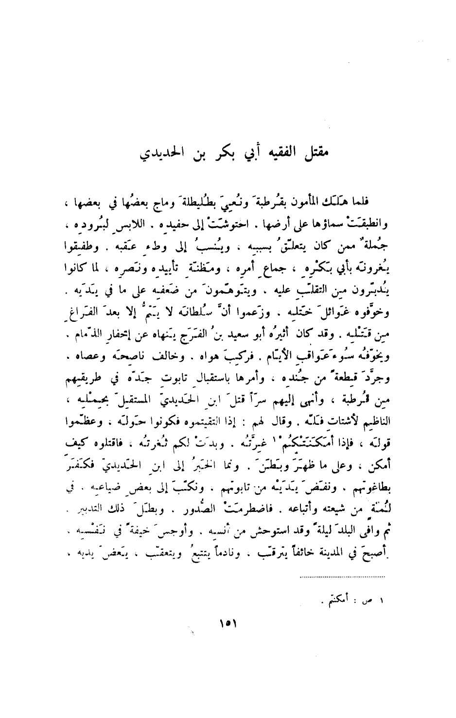 فلما هلك المأمون بقطربة ونعي بطليطلة وماج بعضها في بعضها، وانطبقت سماؤها على أرضهلا، احتوشت إلى حفيده، اللابس لبروده، جملة ممن كان يتعلق بسببه، وينسب إلى وطء عقبه، وطفقوا يغرونه بأبي بكره، جماع أمره، ومظنة تأييده ونصره، لما كانوا يدبرون من التقلب عليه، ويتوهمون من ضعفه على ما في يديه، وخوفوه غوائل ختله، وزعموا أن سلطانه لا يتم إلا بعد الفراغ من قتله. وقد كان أثيره أبو سعيد بن الفرج ينهاه عن إخفار الذمام، ويخوفه سوء عواقب الأيام. فركب هواه، وخالف ناصحه وعصاه، وجرد قطعةً من جنده، وأمرها باستقبال تابوت جده في طريقهم من قرطبة، وأنهى إليهم سراً قتل ابن الحديدي المستقل بحمله، الناظم لأشتات فله. وقال لهم: إذا التقيتموه فكونوا حوله، وعظموا قوله، فإذا امكنتكم غرته، وبدت لكم ثغرته، فاقتلوه كيف أمكن، وعلى ما ظهر وبطن، ونما الخبر إلى ابن الحديدي فكفر بطاغوتهم، ونفض يديه من تابوتهم، ونكب إلى بعض ضياعه، في لمة من شيعته وأتباعه. فاضطرمت الصدور، وبطل ذلك التدبير، ثم وافى البلد ليلةً وقد استوحش من أنسه، وأوجس خيفةً في نفسه، وأصبح في المدينة خائفاً يترقب، ونادماً يتتبع ويتعقب، يعض يديه
