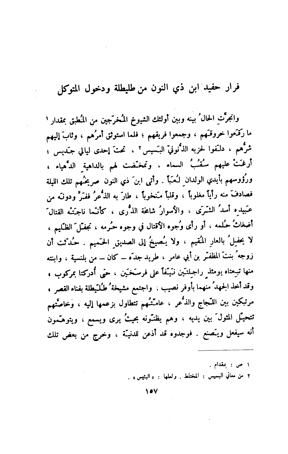 وانجرت الحال بينه وبين أولئك الشيوخ المخرجين من المطبق بمقدار ما رقعوا خروقهم، وجمعوا فريقهم؛ فلما استوثق أمرهم، وثاب إليهم شرهم، دلفوا لحزبه الذنوبي البسيس، تحت إحدى ليالي جديس؛ أرغت عليهم سقب السماء، وتمخضت لهم بالداهية الدهياء، ورؤسهم بأيدي الولدان لعباً، وأتى ابن ذي النون صريخهم تلك الليلة فصادف منه رأياً مغلوباً، وقلباً منخوباً، طار به الذعر ففر ودونه من عبيده أسد الشرى، والأسوار شامخة الذرى، كأنما ناجته القتال أضغاث حلمه، أو رأى وجوه الأقتال في وجوه حرمه، تجفل الظليم، لا يحفل بالعار المقيم، ولا يصيخ إلى الصديق الحميم. حدثت أن زوجه بنت المظفر بن أبي عامر، طريد جده - كان - من بلنسية، وابنته منها تبعتاه يومئذ راجلتين نيفاً على فرسخين، حتى أدركتا بمركوب، وقد أخذ الجهد منهما بأوفر نصيب، واجتمع مشيخة طليطلة بفناء القصر، مرتبكين بين اللجاج والذعر، عامتهم تتطاول بزعمها إليه، وخاصتهم تتحيل المثول بين يديه، وهم يظنونه بحيث يرى ويسمع، ويتوهمون أنه سفعل ويصنع، فوجدوه قد أذعن للدنية، وخرج من بعض تلك